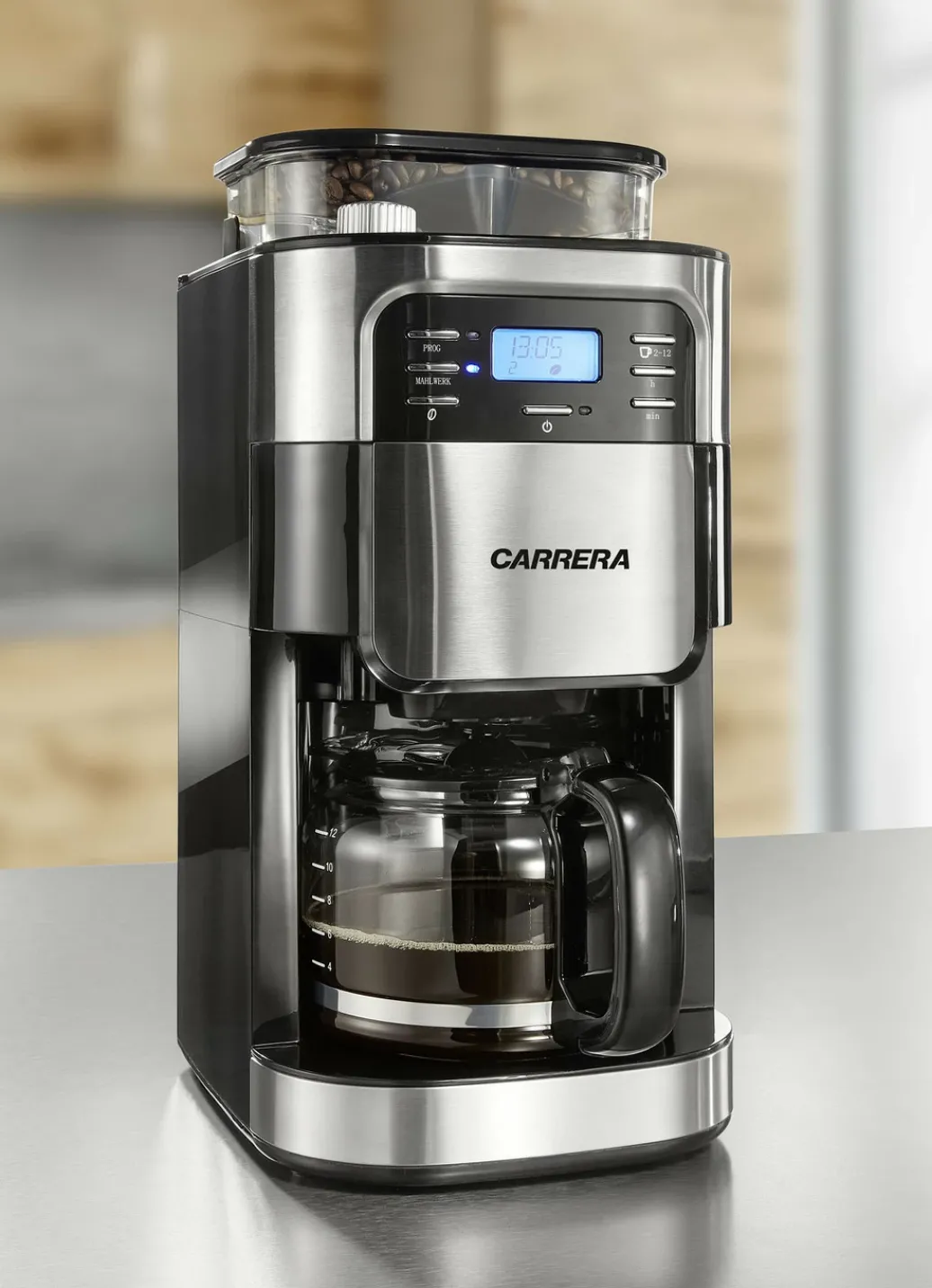 „Carrera“ Aroma-Kaffeemaschine aus Edelstahl mit hochwertiger 1,5-Liter-Glaskanne für bis zu 12 Tassen. Mit Mahlwerk. Mahlgrad, Kaffeemenge und Aromastärke in 3 Stufen einstellbar. Für Kaffeebohnen oder -pulver geeignet. Mit Permanentfilter für maximales Aroma. Keine Filtertüten notwendig. Automatisch mahlen und brühen oder mit gemahlenem Kaffee direkt brühen. 24-h-Zeitschaltuhr für zeitversetztes Mahlen und Brühen oder nur Brühen. 200-g-Vorratsbehälter für Bohnen, lichtgeschützt für bestes Aroma. Vorwahl Tassenanzahl von 2-12 Tassen einstellbar. 1,5-l-Wassertank mit Wasserfüllstandsanzeige. LC-Display mit Zeitanzeige. Warmhalteplatte mit automatischer Abschaltung nach ca. 35 Min. Antitropf-Funktion.