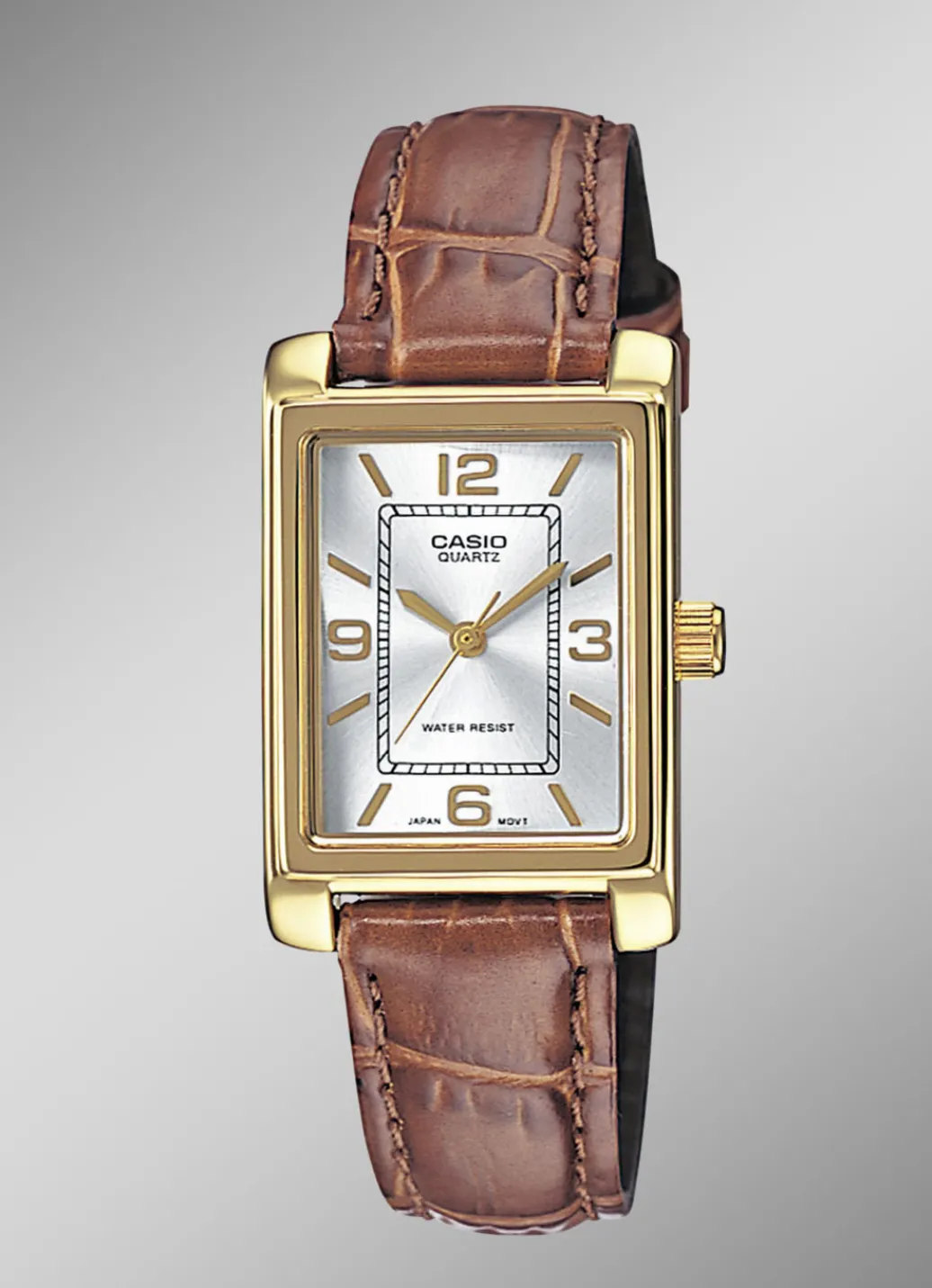 Erleben Sie zeitlose Eleganz mit der Casio Damenuhr, die klassisches Design mit moderner Technologie verbindet. Mit einem Gehäusedurchmesser von 21 mm und einem goldfarbenen Edelstahlgehäuse ist diese Uhr ein echter Blickfang. Das Lederband fügt eine traditionelle Note hinzu, während die Dornschließe für einen sicheren und bequemen Sitz sorgt.