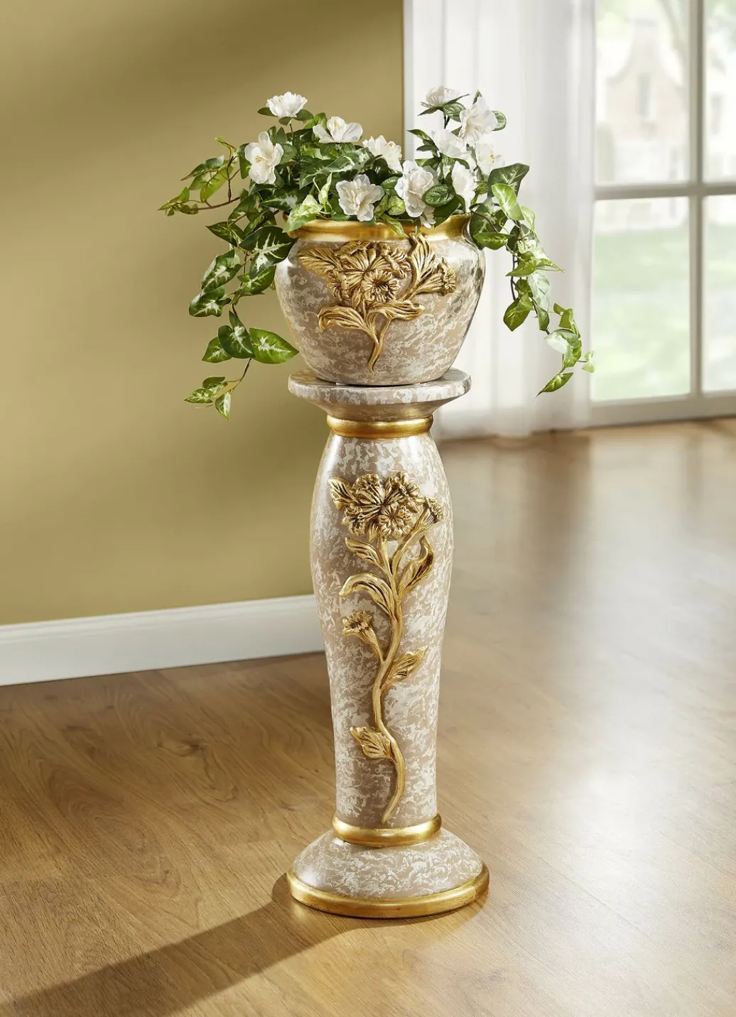 Handbemalte Säule mit Übertopf in Hellbraun-Gold.