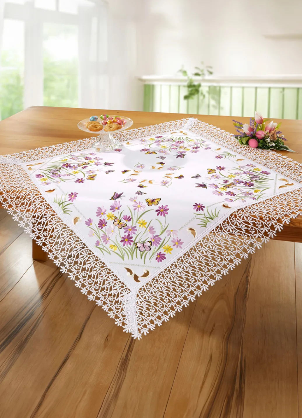 Setzen Sie mit dieser hübsch bestickten Tisch- und Raumdekoration frühlingshafte Blickpunkte in Ihrem Zuhause. Die vielen Blümchen und Schmetterlinge werden durch die hochwertige Spitzenborte besonders schön hervorgehoben. Kissenbezug mit praktischem Reißverschluss.