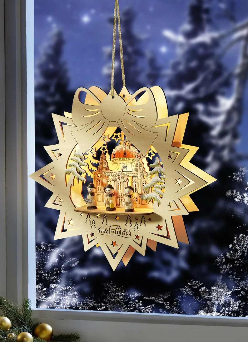 Dieses wunderschöne Fensterbild ist in Form eines Sterns mit einer großen Schleife gefertigt. In der Mitte befindet sich ein detailreiches Motiv der Dresdner Frauenkirche mit 3 Kurrende-Sängern. Die integrierten 5 LEDs bringen es stimmungsvoll zum Leuchten. Liebevoll aus Holz gefertigt. Batteriebetrieben mit 2x 1,5 Volt Mignon (nicht im Lieferumfang enthalten). Maße: B29,5xH29,5xT6,5 cm