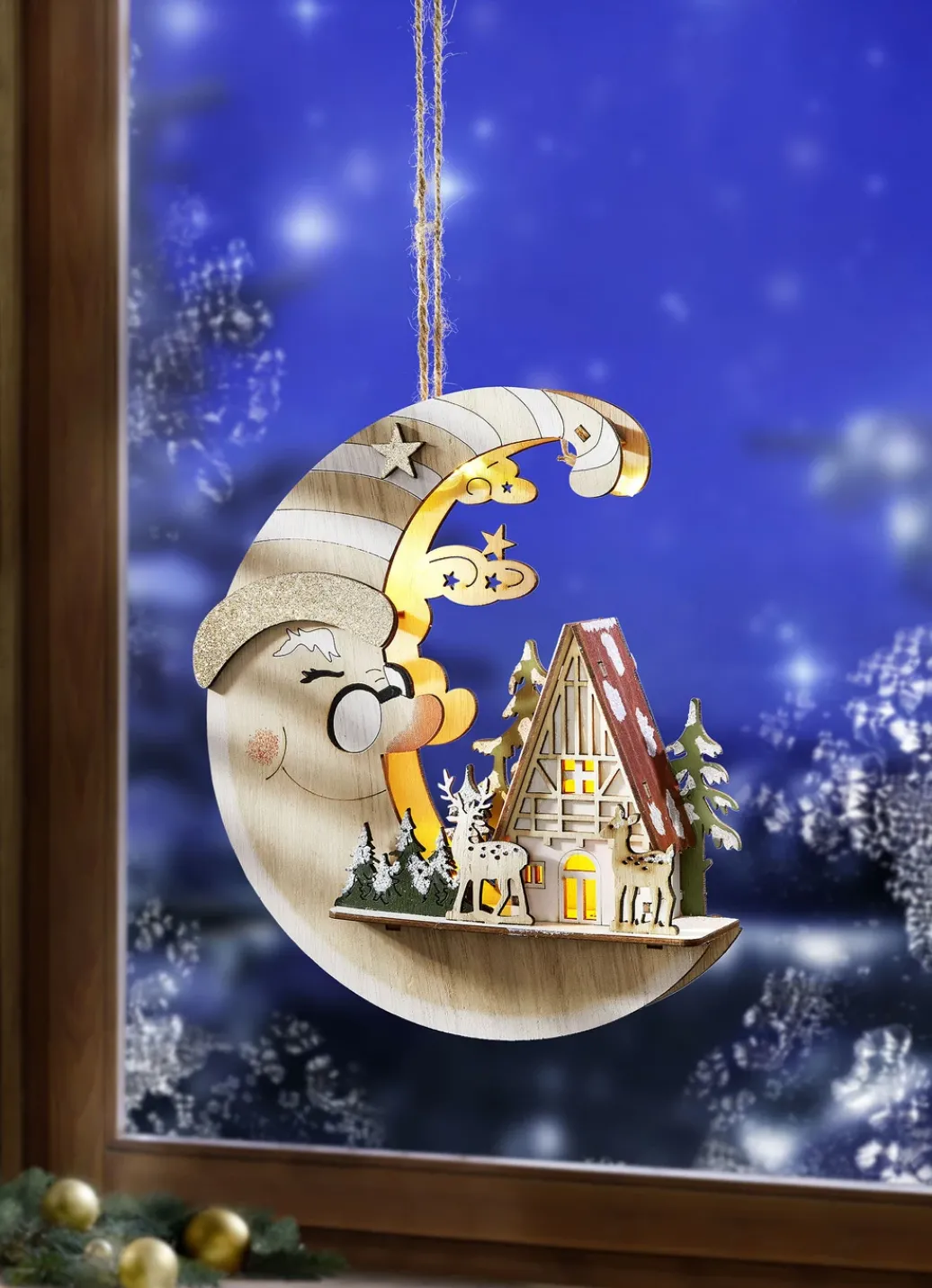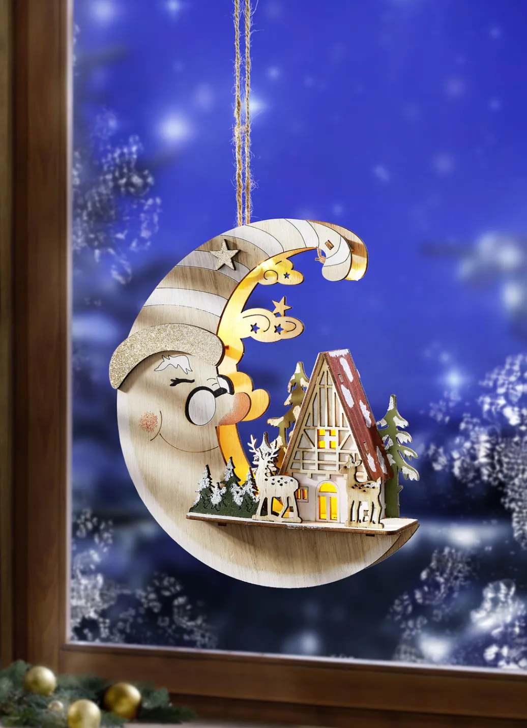 Eine stimmungsvolle Dekoration für die Weihnachtszeit ist dieses beleuchtete Fensterbild aus Holz in Form eines Mondes. Der friedlich schlummernde Mond wacht über die kleine beleuchtete Waldhütte mit Rehen. Mit 6-Stunden-Timer. Batteriebetrieben mit 2x 1,5 Mignon (nicht im Lieferumfang enthalten).