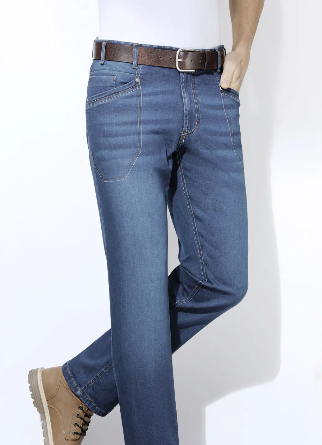 „Francesco Botti”-Jeans: Seitentaschen mit Nietenzier, Kleingeldtasche, Kontrastziernähte, Jeanssattel sowie aufgesetzte Gesäßtaschen mit Ziersteppung.