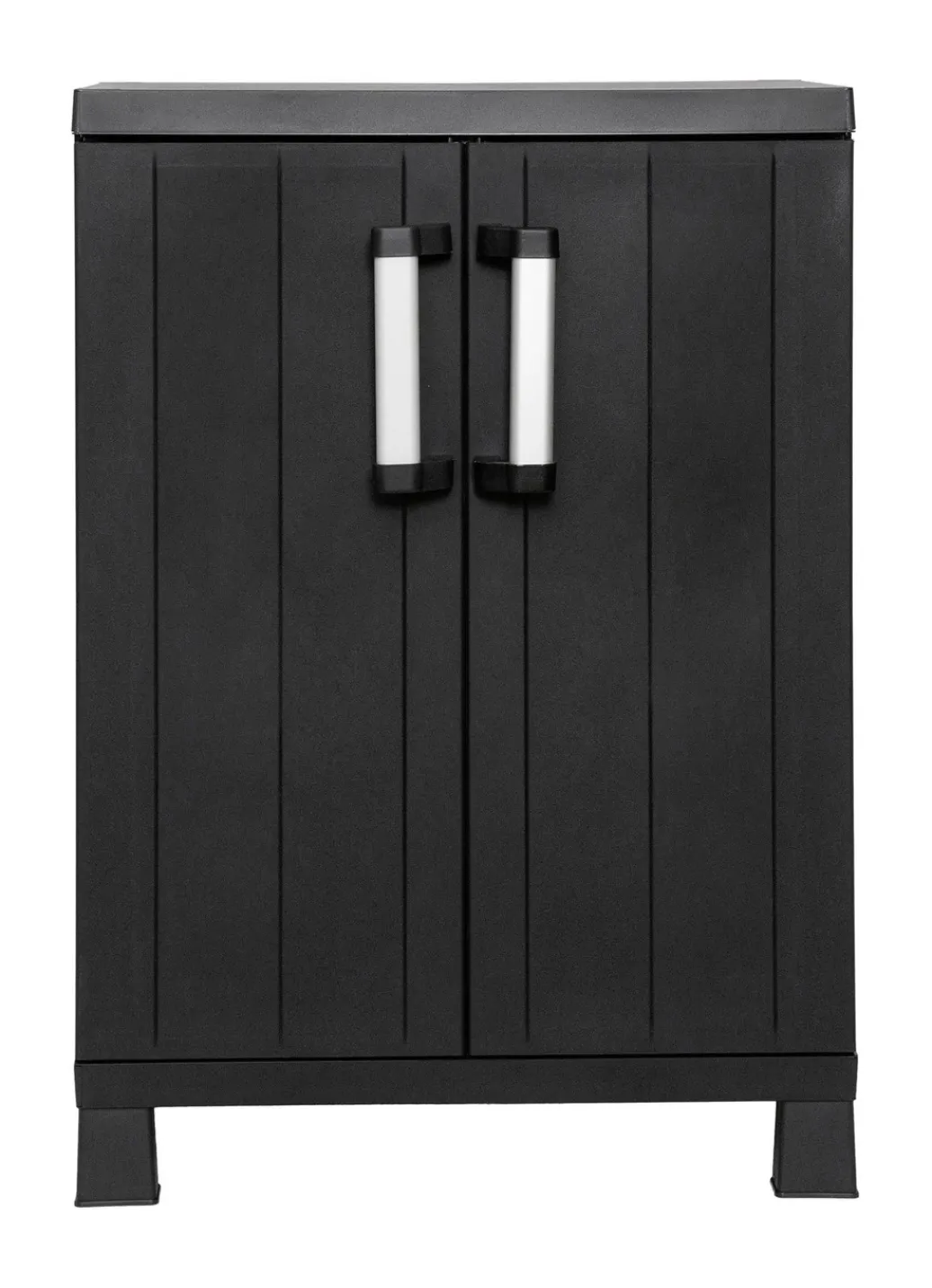 Geräteschrank Garage mit Holzlamellen-Effekt in der Ausführung klein und in Schwarz.