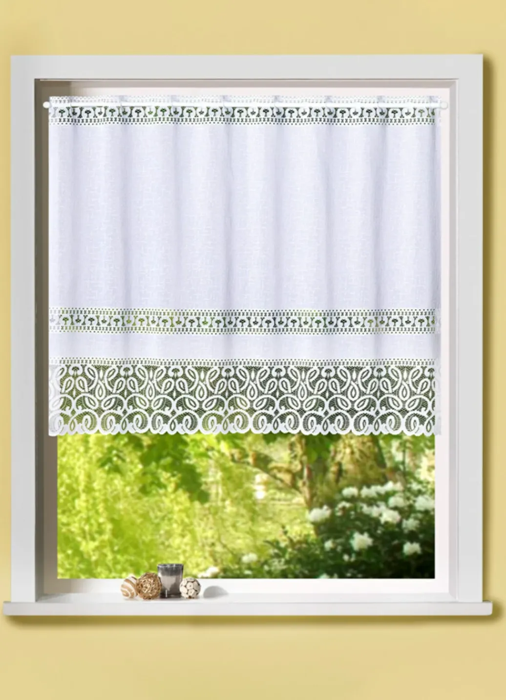 Ein ganz besonders dekorativer Blickfang ist dieser Kleinfenster-Store mit Stangendurchzug sowie ausdrucksstarker Musterung und gebogtem Abschluss. Qualität: Jacquard aus 100% Polyester. Nach Öko-Tex Standard 100