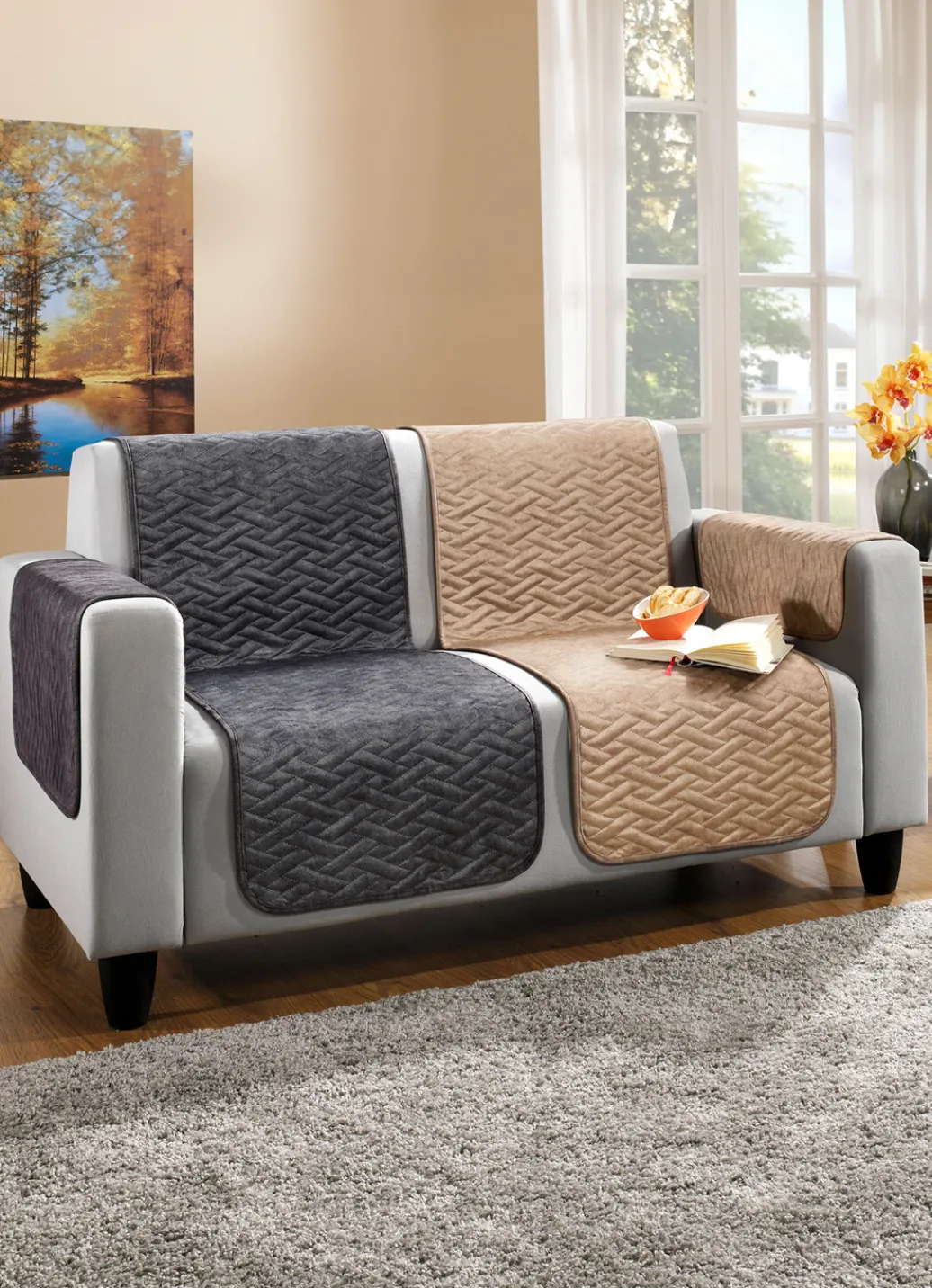 Wohnaccessoires in Wildleder-Optik mit Anti-Rutsch-Rückseite in Größe 101 (Sesselschoner, 50×150 cm) und in Beige.