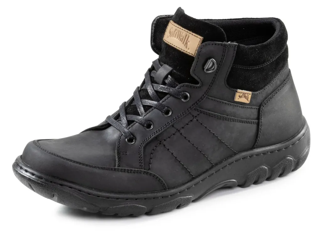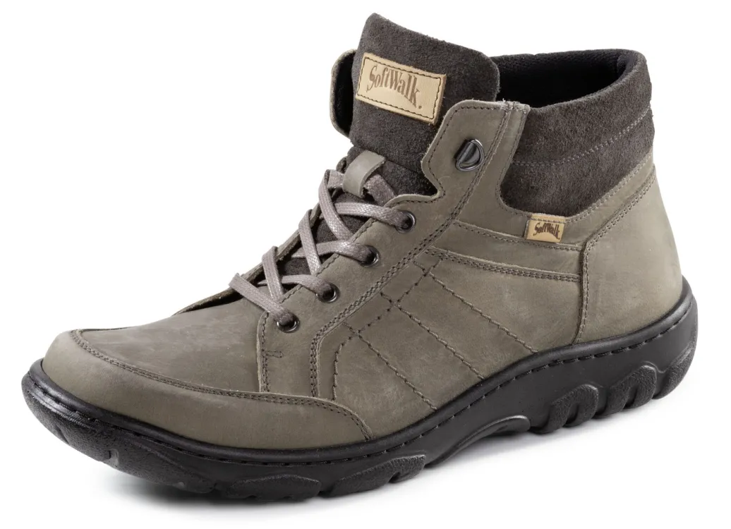 Schnür-Boot aus gefettetem Nubuk- und Veloursleder: Innenreißverschluss, Textilfutter, herausnehmbares, atmungsaktives Fußbett sowie leichte Synthetik-Profilsohle. Schafthöhe ca. 13 cm