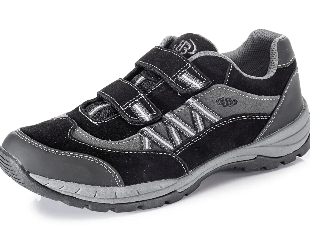 Slipper aus Rind-Veloursleder mit Besätzen aus Synthetik und Textil: zwei verstellbare Klettspangen, Textilfutter, herausnehmbares Lederfußbett sowie leichte CME-Profilsohle