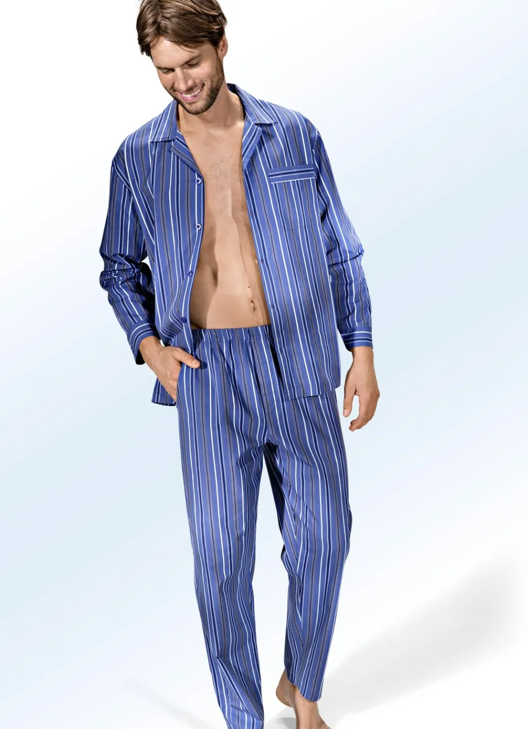 In diesem geschmackvollen Schlafanzug mit Webstreifendessin fühlen Sie sich in warmen Nächten besonders wohl! Durchgeknöpftes Oberteil mit Reverskragen sowie aufgesetzter Brusttasche. Dazu passt die lange Hose mit auswechselbarem Gummizug im Bund, Seitentaschen, knöpfbarem Eingriff sowie offenen Beinabschlüssen.