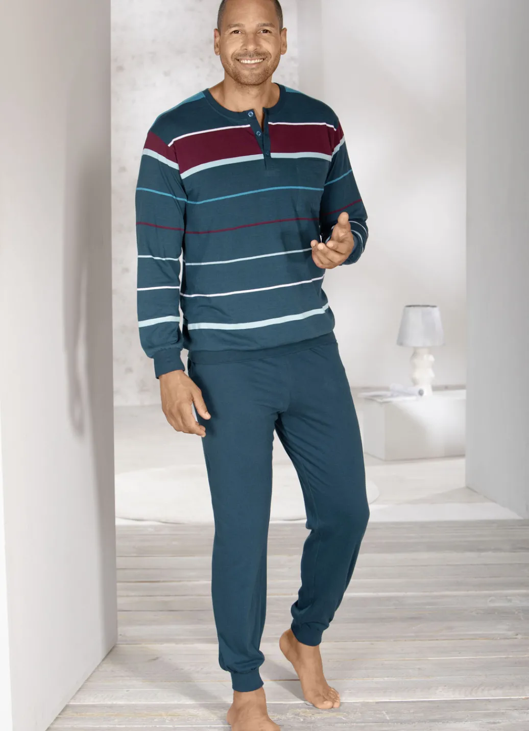 Modischer Schlafanzug in Petrol-Bunt mit Bündchenabschlüssen. Oberteil mit farbharmonischem, garngefärbtem Ringeldessin, Knopfleiste sowie aufgesetzter Brusttasche. Lange Hose mit Seitentaschen und Dehnbund.