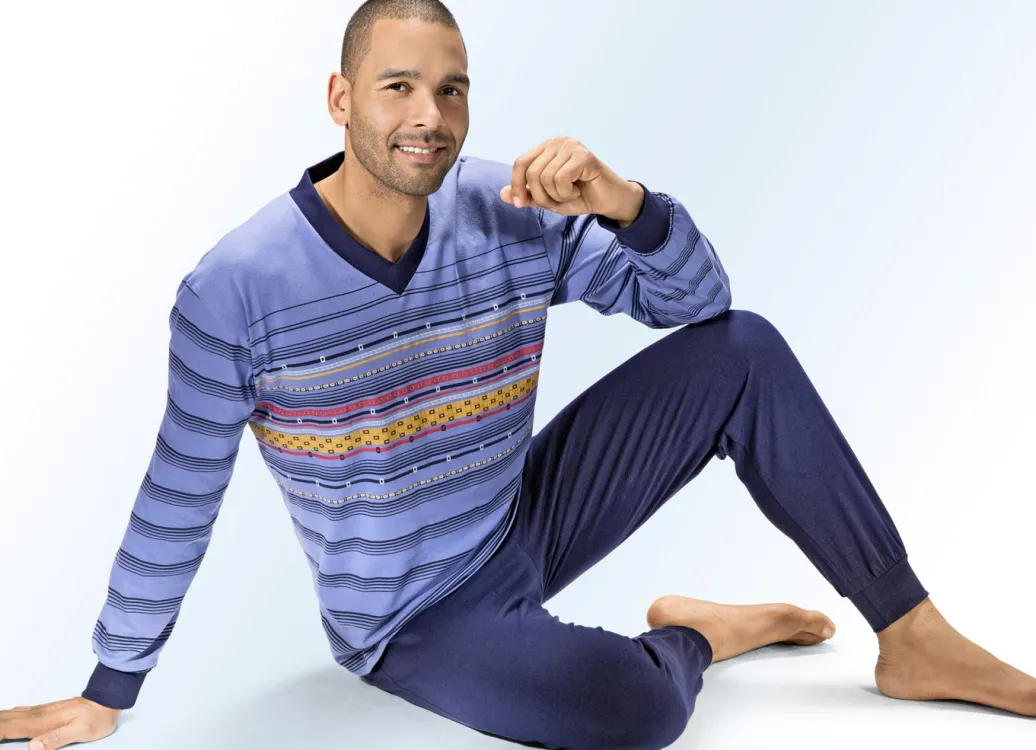 Farbharmonischer Schlafanzug mit komfortablen Bündchen an den Ärmel- und Beinabschlüssen! Das Oberteil zeigt sich mit V-Ausschnitt sowie mit einem platziertem Druckdessin vorne. Lange Hose mit auswechselbarem Gummizug im Bund.