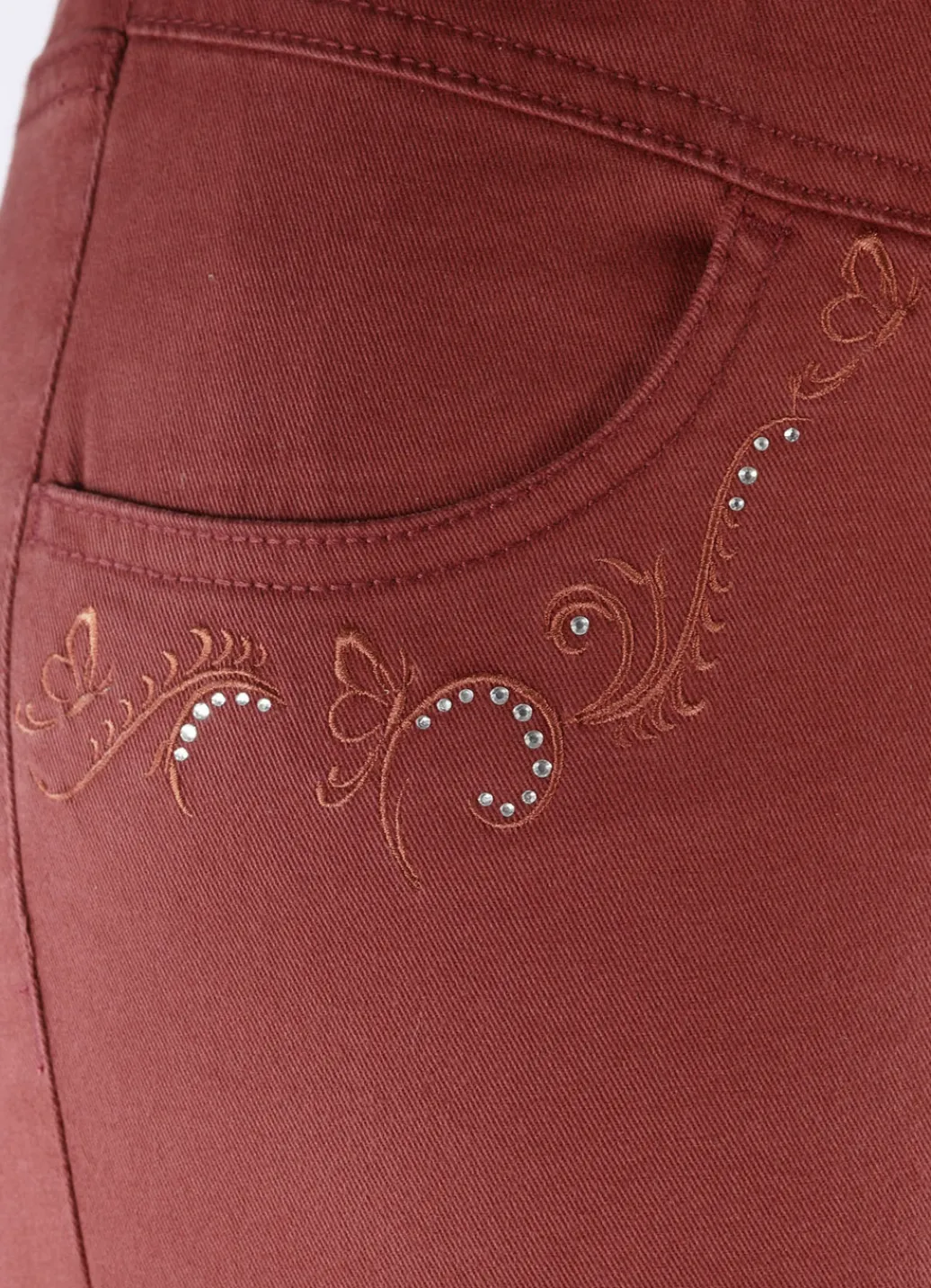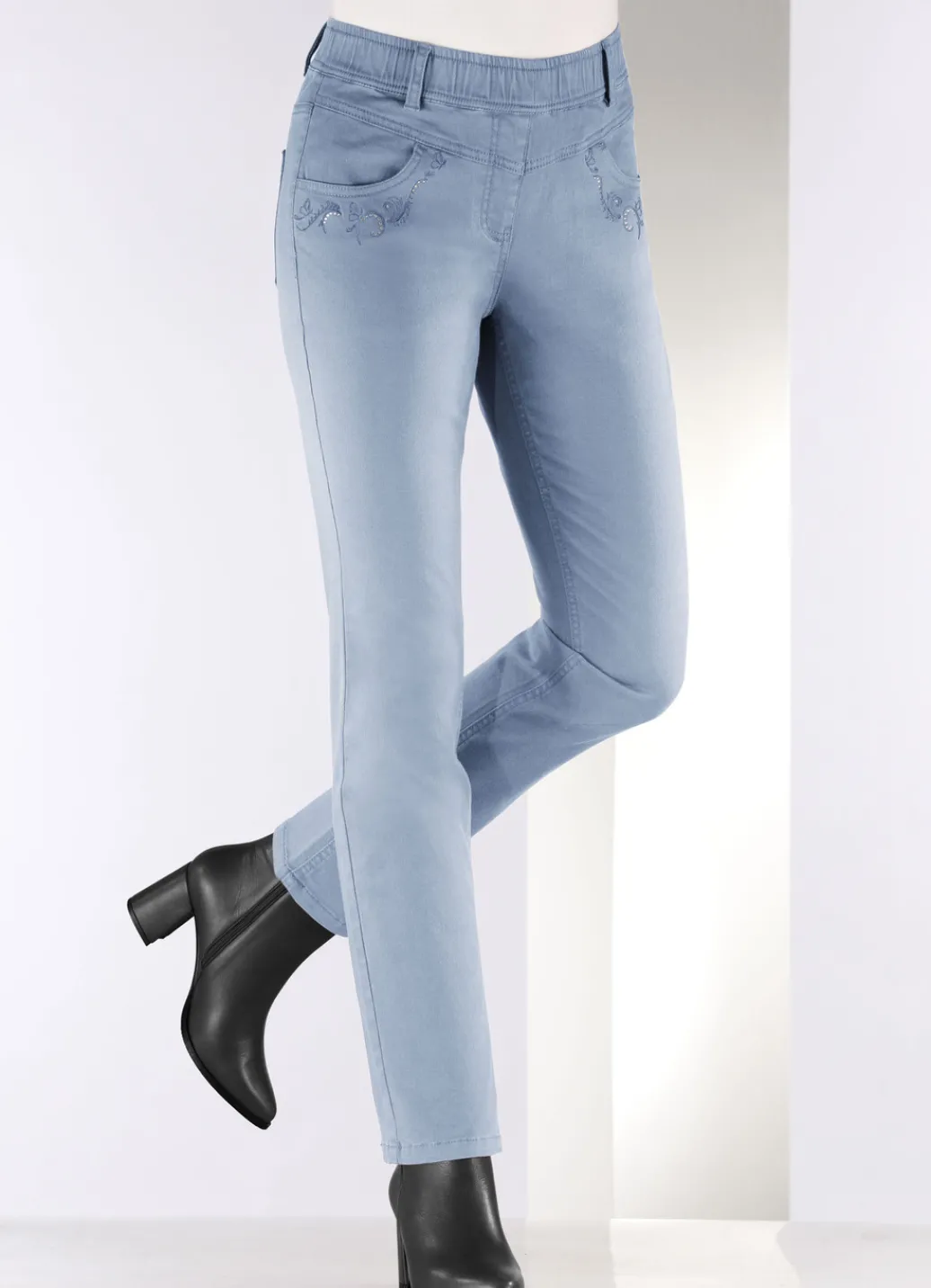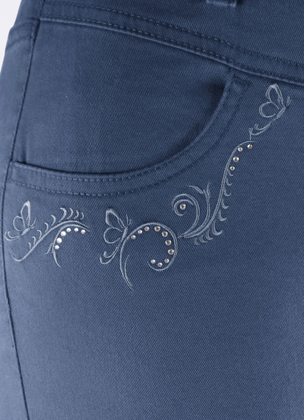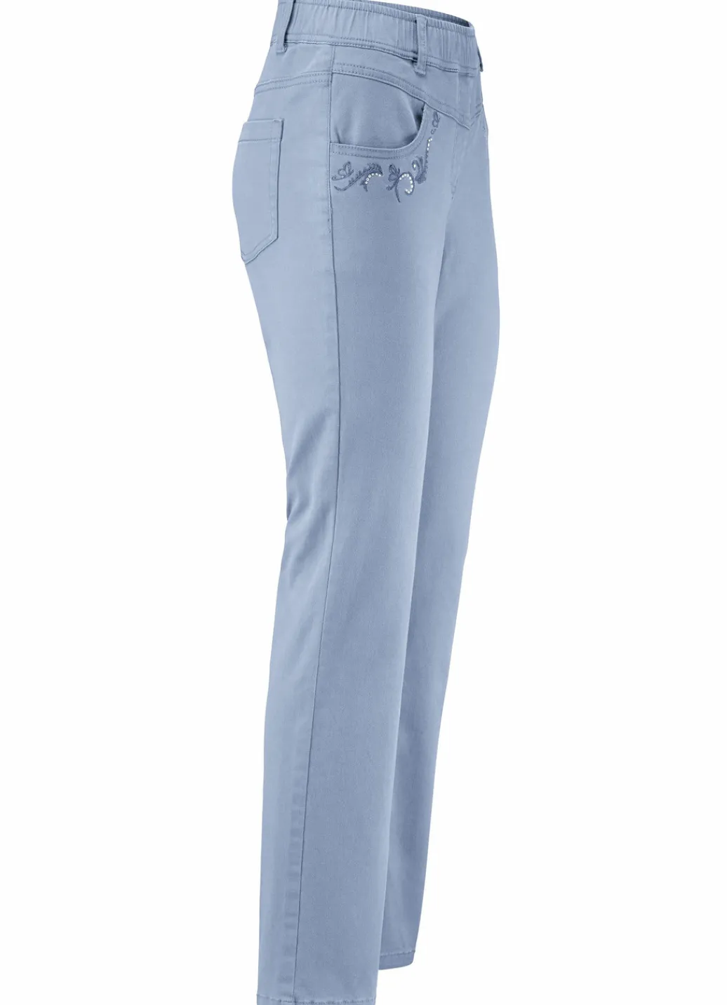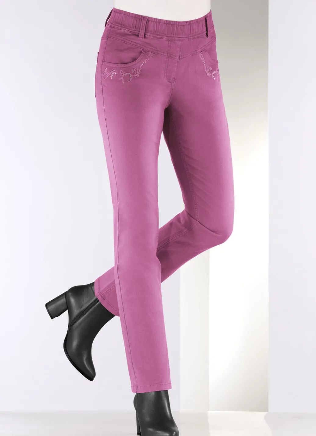 Ansprechende Hose in komfortabler Schlupfform, mit Dehnbund rundum, Gürtelschlaufen, angedeutete Reißverschlusszierblende, Seitentaschen mit kontrastfarbener Stickerei und funkelnden Glitzersteinchen, aufgesetzte Gesäßtaschen sowie figurformende Passe im Vorder- und Rückteil. Innenbeinlänge ca. 76 cm, Fußweite ab 36 cm.