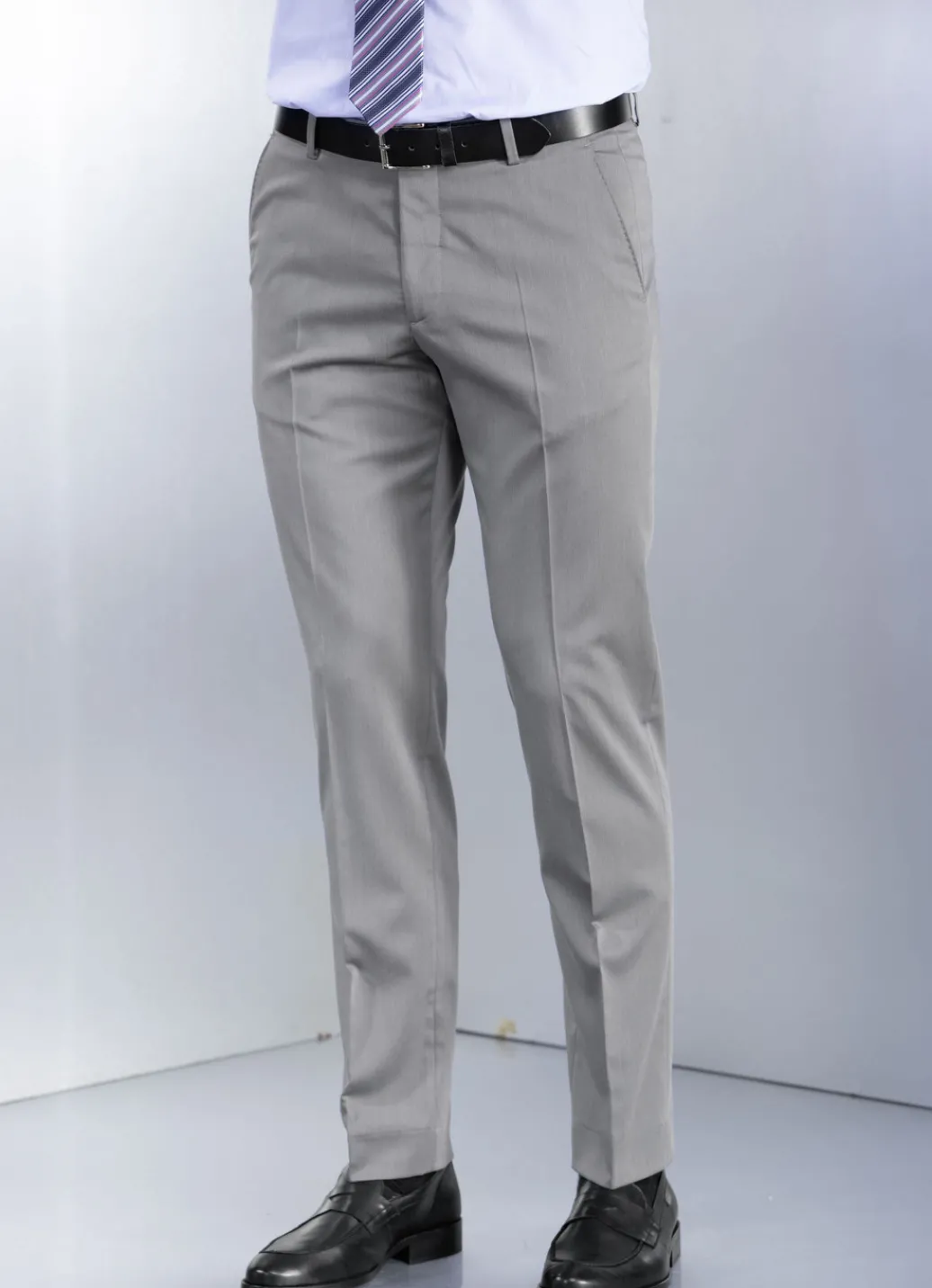 Mittelgrau melierte Hose mit Seitentaschen und zwei Gesäßpaspeltaschen mit Knopf. Ohne Gürtel.