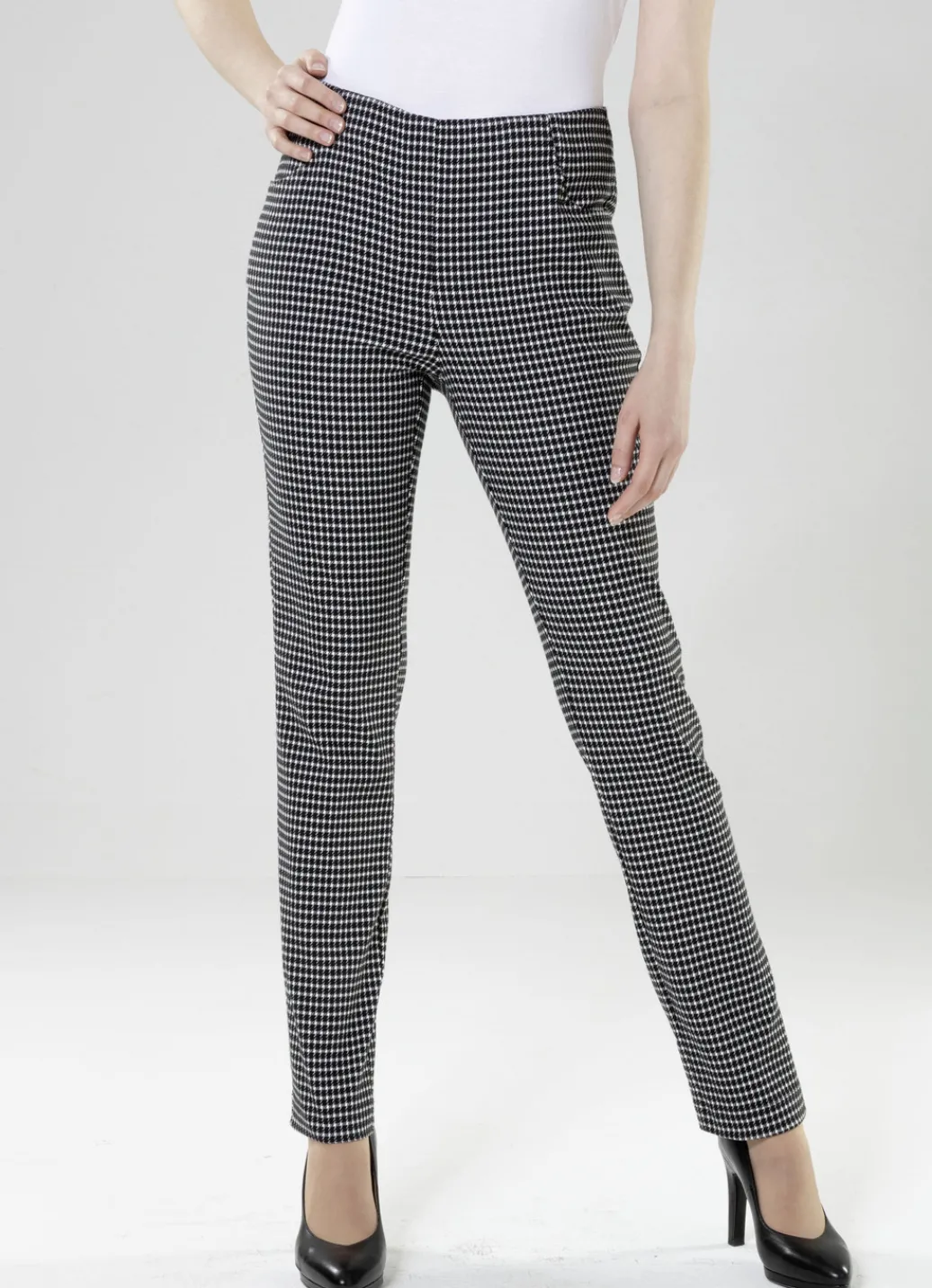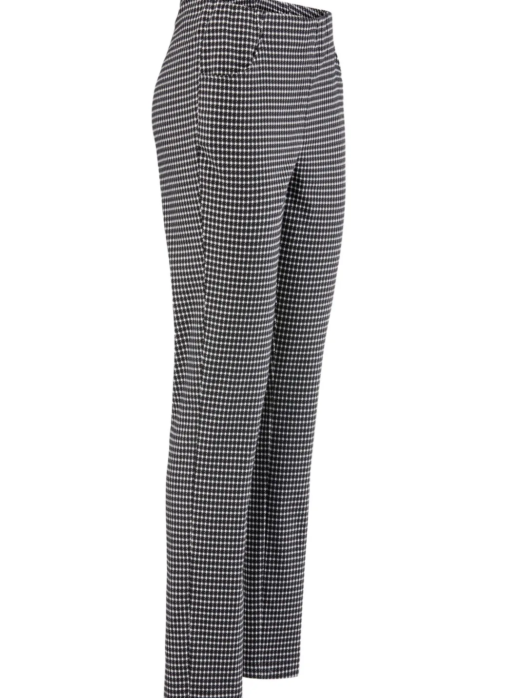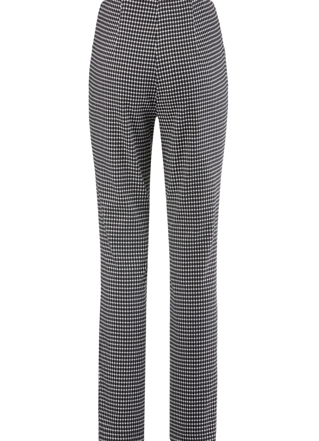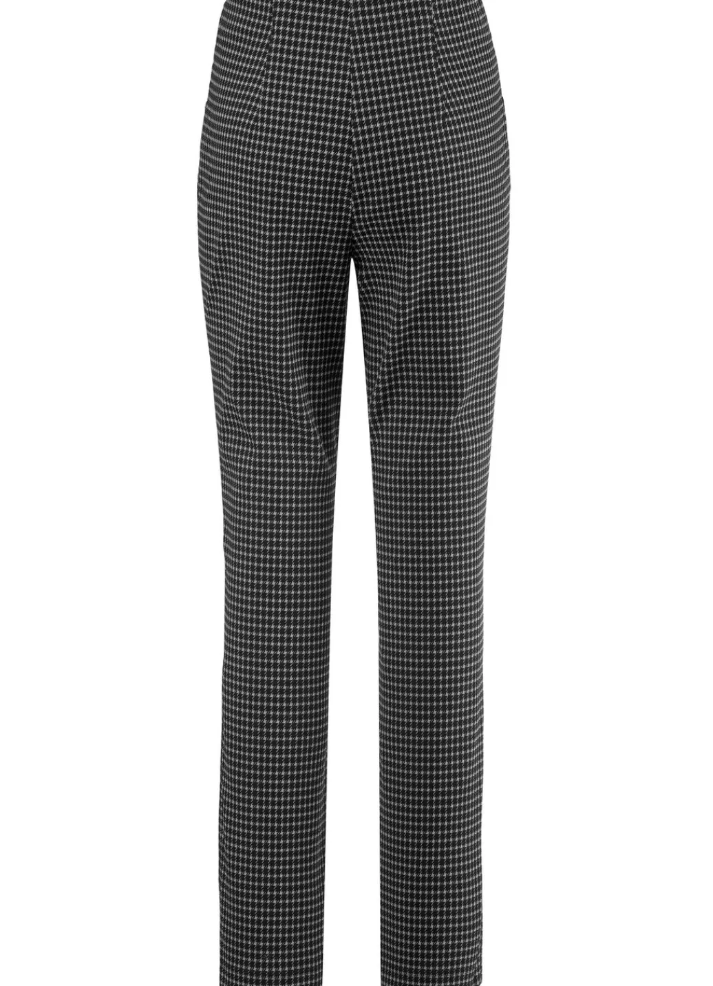 Angesagte Hose mit trendiger Hahnentritt-Dessinierung: in bequemer Schlupfform, figurformend durch den angeschnittenen Bund, glatt anliegend dank der innenliegenden Gummibund-Einlage sowie Seitentaschen. Innenbeinlänge 78 cm, Fußweite ab 32 cm.