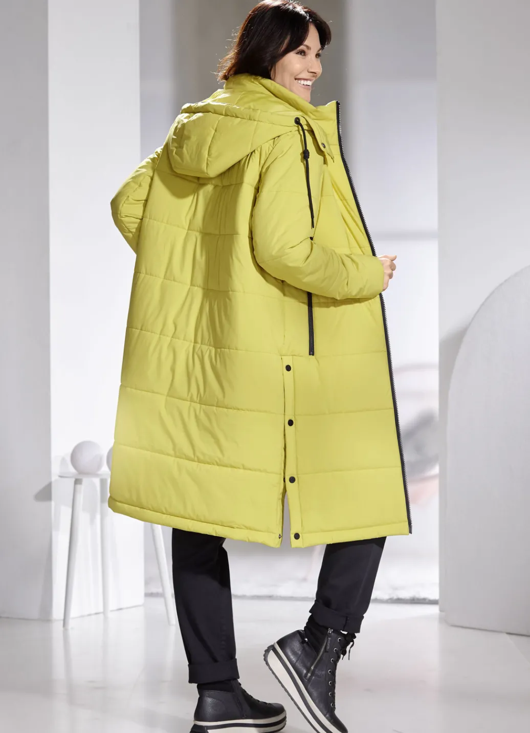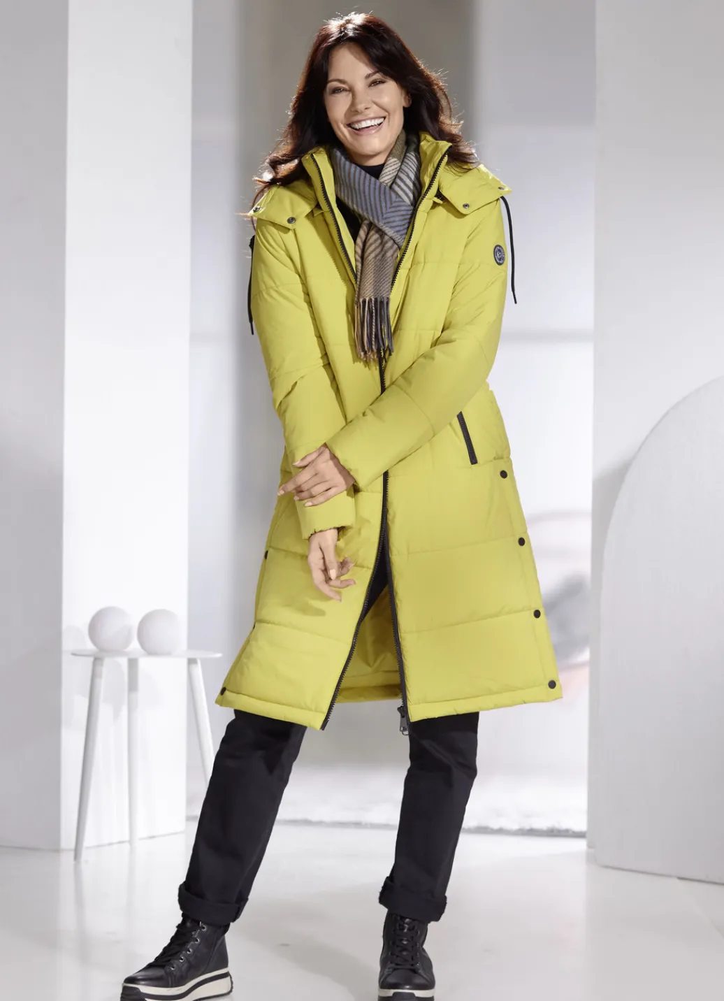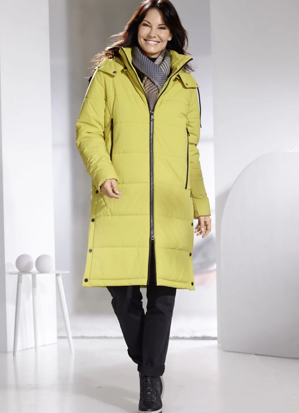 Trendstarker Mantel mit Riegel, Druckern und Durchzugsband an der abnehmbaren Kapuze, durch 2-Wege-Reißverschluss hoch schließbarem Stehkragen, geräumigen Reißverschlusstaschen, Druckern an den Seitenschlitzen, elastischen Ärmelabschlüssen sowie einer Innentasche. Länge ca. 102 cm, ab Gr. 42 ca. 104 cm, ab Gr. 48 ca. 106 cm.