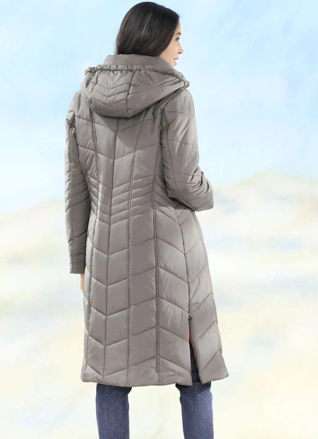 Ansprechender Mantel mit Durchzugsband und Stopper in der abnehmbaren Kapuze, durch Reißverschluss unter der Druckerleiste hoch schließbarem Stehkragen, Reißverschluss an den Nahttaschen und Seitenschlitzen, umschlagbaren Ärmeln sowie einer Innentasche. Länge ca. 105 cm.