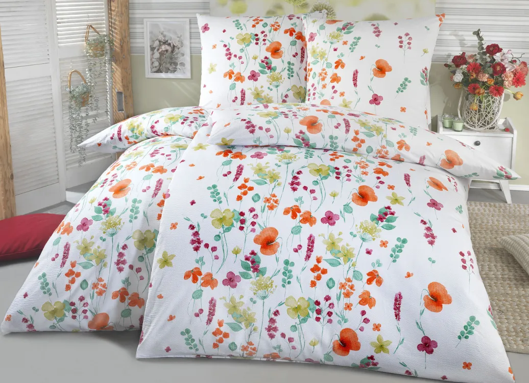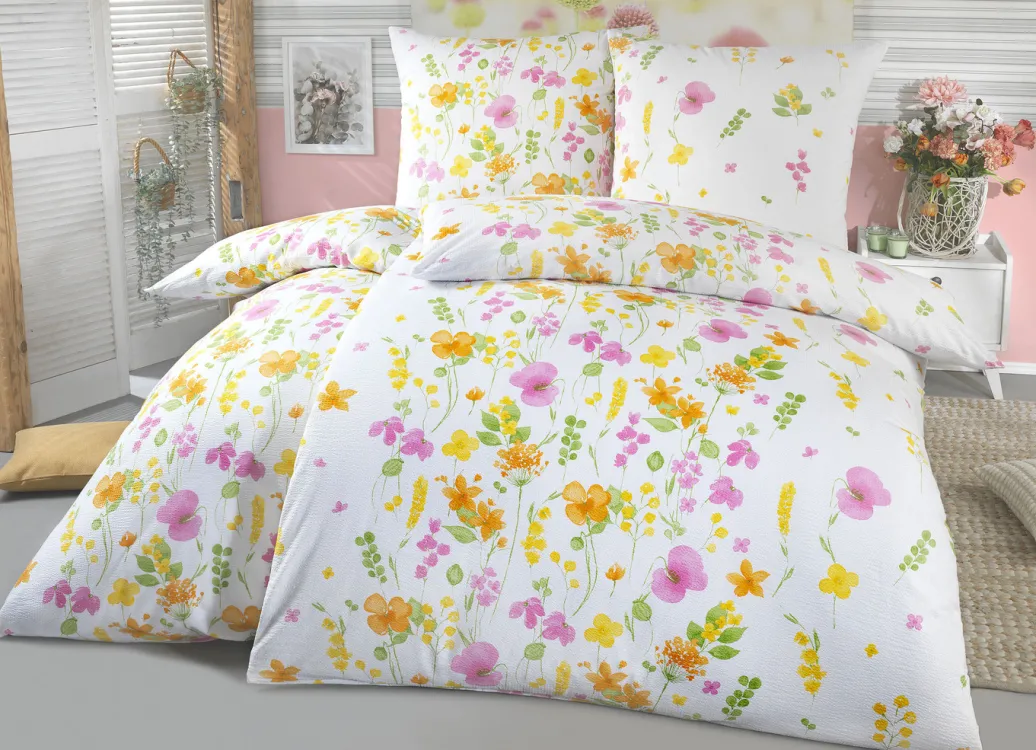mit zartem Blütendessin in frischen Farben. Mit praktischem Reißverschluss. Die Qualität: Seersucker aus 100% Baumwolle. Waschbar bis 60 °C und trocknergeeignet.