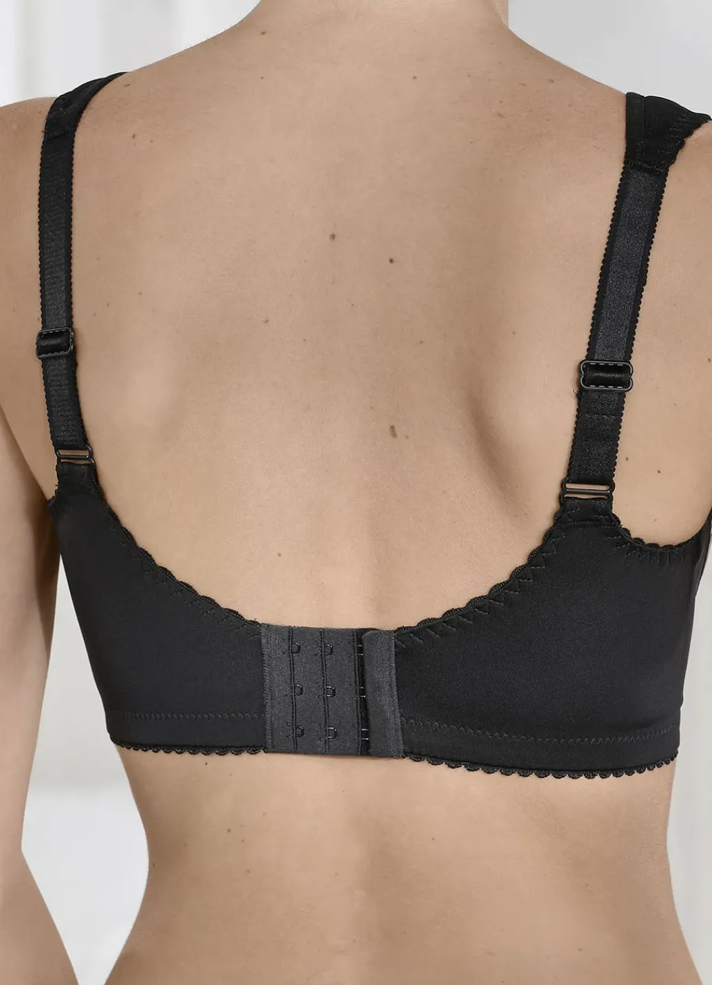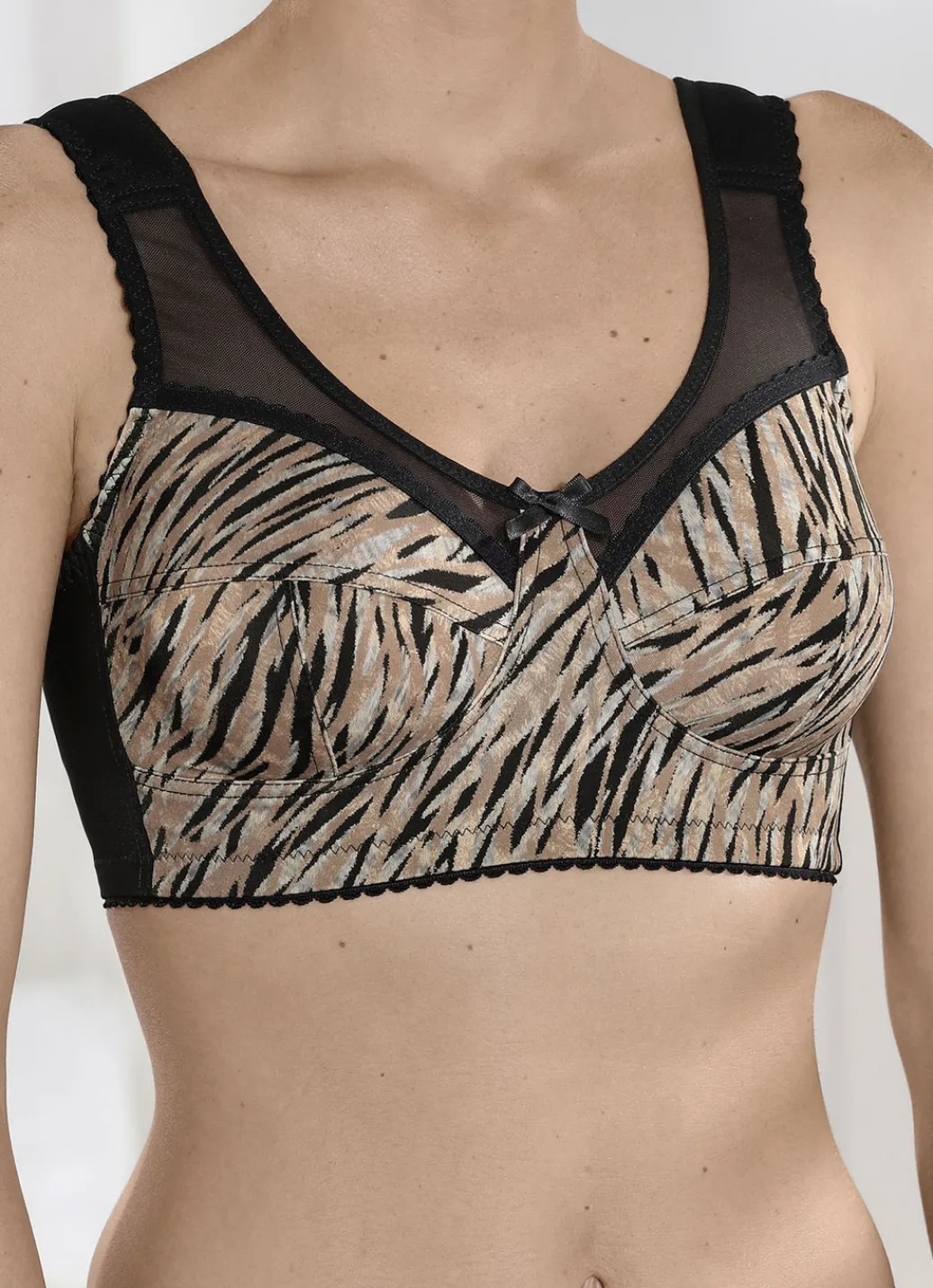 Schwarzer BH mit farbharmonischem Raubtierdessin im Vorderteil, elastischem Tülleinsatz am Dekolleté, unterlegten Cups sowie breiten, im Schulterbereich weich gepolsterten, verstellbaren Stretchträgern.
