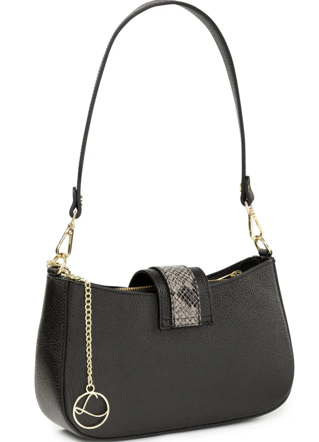 Tasche von „Laurina“, aus schwarzem, genarbtem Kalb-Nappaleder und grauem Kalbleder mit Reptilprägung: Überschlag mit Magnetverschluss, je ein Haupt- und Innenfach mit Reißverschluss, Textilfutter. Ein Trageriemen ca. 55 cm und ein verstellbarer Umhängeriemen ca. 66-125 cm, jeweils abnehmbar. Gr: 27x15x7 cm