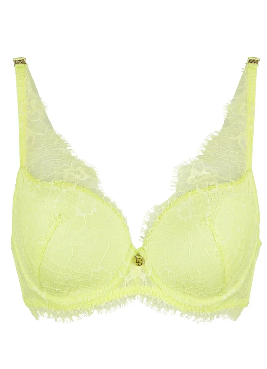 Limettefarbener „LingaDore“-Bügel-BH mit Vorderteil aus zarter Spitze, weich gepolsterten Cups, seitlichen Stützstäbchen, Rückteil aus Elastiktüll sowie verstellbaren Stretchträgern.
