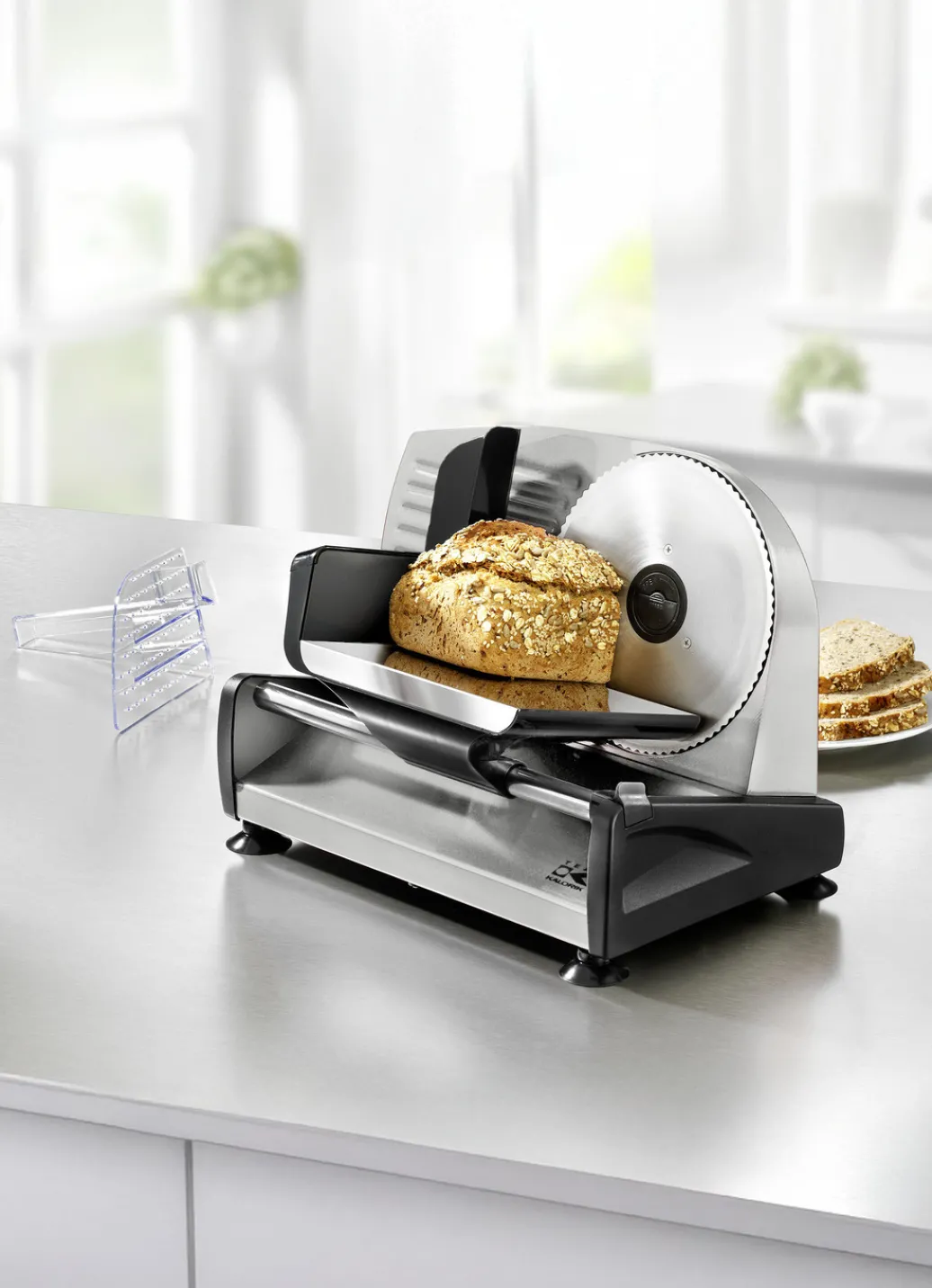 Metall-Allesschneider mit Universalmesser mit Wellenschliff und zusätzlichem Schinkenmesser (je ø ca. 19 cm) aus hochwertigem Edelstahl. Schneidet schnell und präzise Brot, Wurst, Käse, Schinken, Fleisch uvm. Mit Sicherheitsschalter. Verschleißarmer Zahnradantrieb für optimale Kraftübertragung. Schnittbreite stufenlos einstellbar von 0 bis 15 mm. Großflächiger, abklappbarer und abnehmbarer Schneidgut-Schlitten mit hygienischem Edelstahlboden. Schräger Auflagetisch für Schneiden nahezu ohne Kraftanstrengung. Sicherer Stand durch 4 Gummisaugnäpfe. Abnehmbarer Schneidguthalter mit Fingerschutz. Messer zur einfachen Reinigung abnehmbar. 150 Watt. Maße: B24xH27,5xT38,5 cm