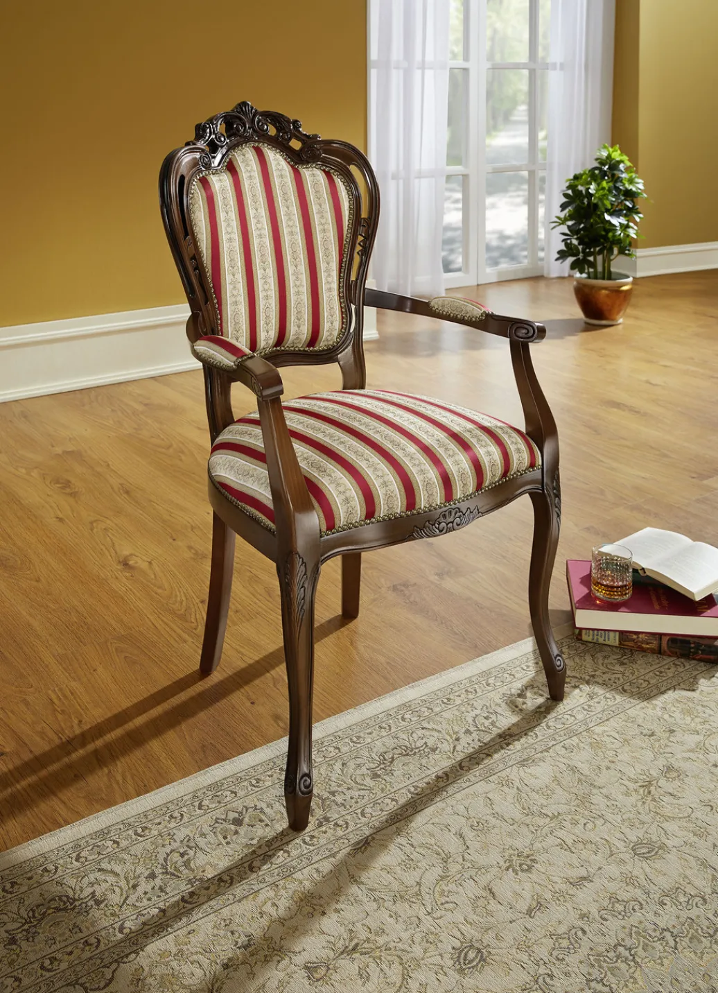 Armlehnenstuhl in Nussbaum-Rot.