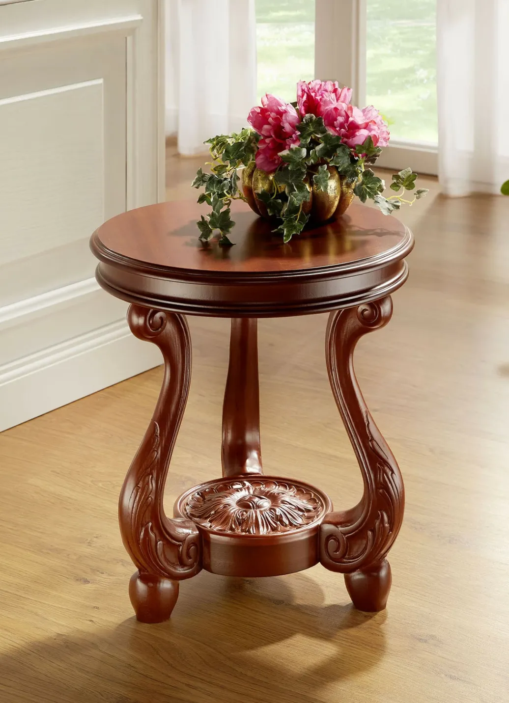Setzen Sie einen royalen Akzent in Ihrem Wohnraum! Mit diesem schön gearbeiteten, teilmassiven Beistelltisch gelingt Ihnen das spielend. Das filigran geschwungene Gestell mit reichhaltiger Schnitzerei aus nussbaumfarbenem Buchenholz.
