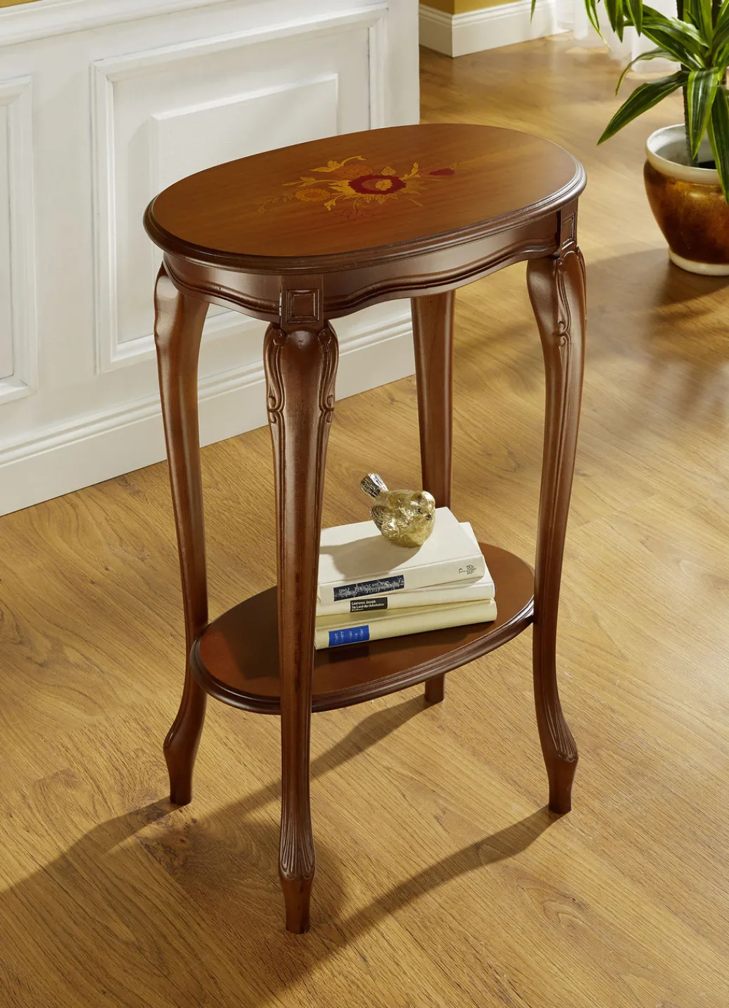 Beistelltisch mit oder ohne Intarsien in der Ausführung ohne Intarsien und in Nussbaum.