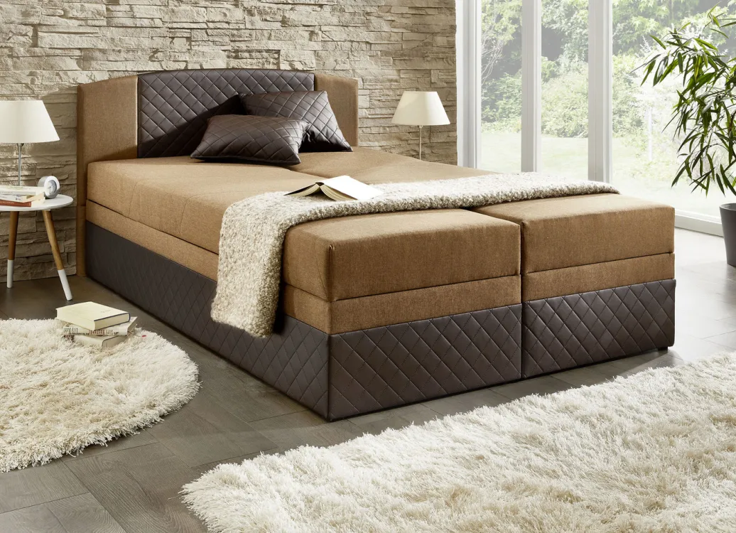 Erleben Sie erholsamen Schlafkomfort mit diesem stilvollen Boxspringbett mit verstellbarem Kopfteil! Auf den 2 geräumigen Bettkästen, die jeweils vorne zu öffnen sind, befindet sich jeweils eine Bonellfederkern-Matratze mit komfortabler Schaumstoffpolsterung. Belastbar bis 120 kg je Seite. Mit Bezug aus Stoff (100% PES) und Kunstleder (100% PU). Mit 2 Kissen (je 40×50 cm, Farbe je nach Kunstlederfarbe).