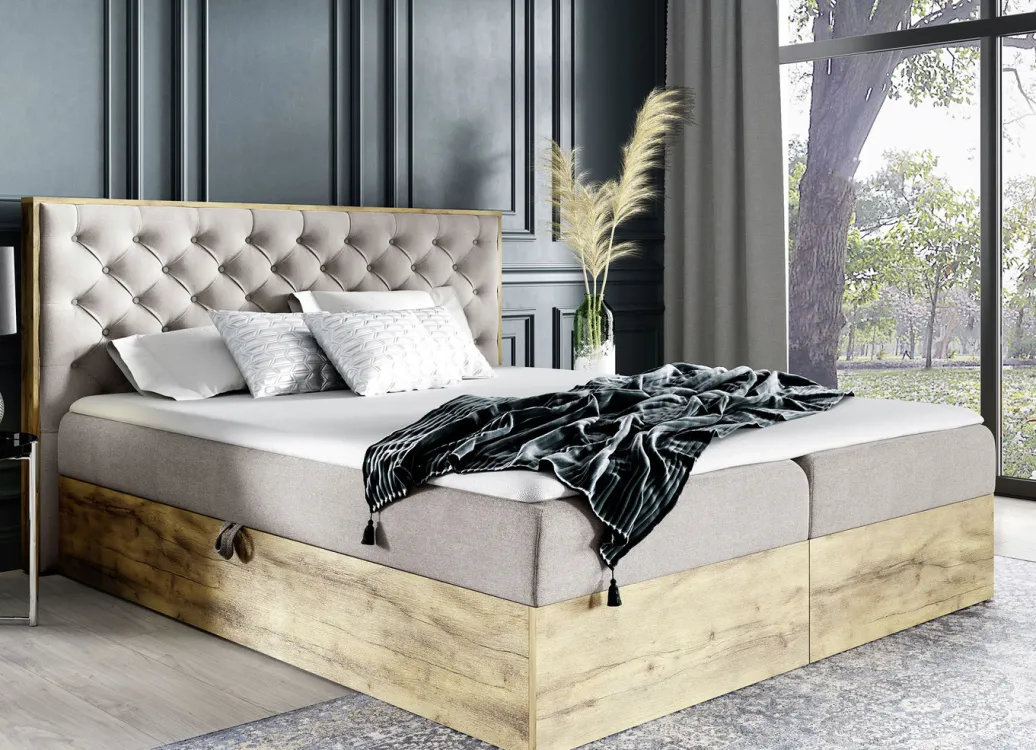 Komfortables Boxspringbett mit eleganter Knopfsteppung am Kopfteil. Der hochwertige Rahmen aus Wotan Eiche verleiht dem Bett eine stilvolle Optik. Mit geräumigem Bettkasten (bei 90×200 cm Bettkasten von vorne zu öffnen, ab 140×200 cm Bettkästen seitlich zu öffnen).