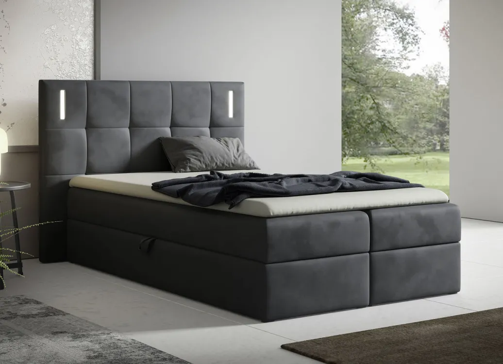 Erholsame Nächte erwarten Sie in diesem sehr eleganten Boxspringbett. Die modische Steppung sowie die integrierte LED-Beleuchtung (anschalten durch Berührung) am Kopfteil, verleihen eine besondere Stimmung im Schlaf-oder Jugendzimmer. Auf dem hochwertigen Echtholzgestell liegt eine Bonnellfederkernmatratze (Härtegrad 3, belastbar bis 120 kg, Höhe 20 cm), welche für hohen Schlafkomfort sorgt. Der 5 cm hohe Kaltschaumtopper passt sich dem Körper an und hat einen abnehmbaren Bezug (waschbar bis 40 °C). Angenehmer Bezug aus Stoff (100% Polyester). Mit 2 geräumigen Bettkästen (seitliche Öffnung) mit großzügigem Stauraum. Auf Kunststoffgleitern. Mit Aufbau-Anleitung zur einfachen Selbstmontage
