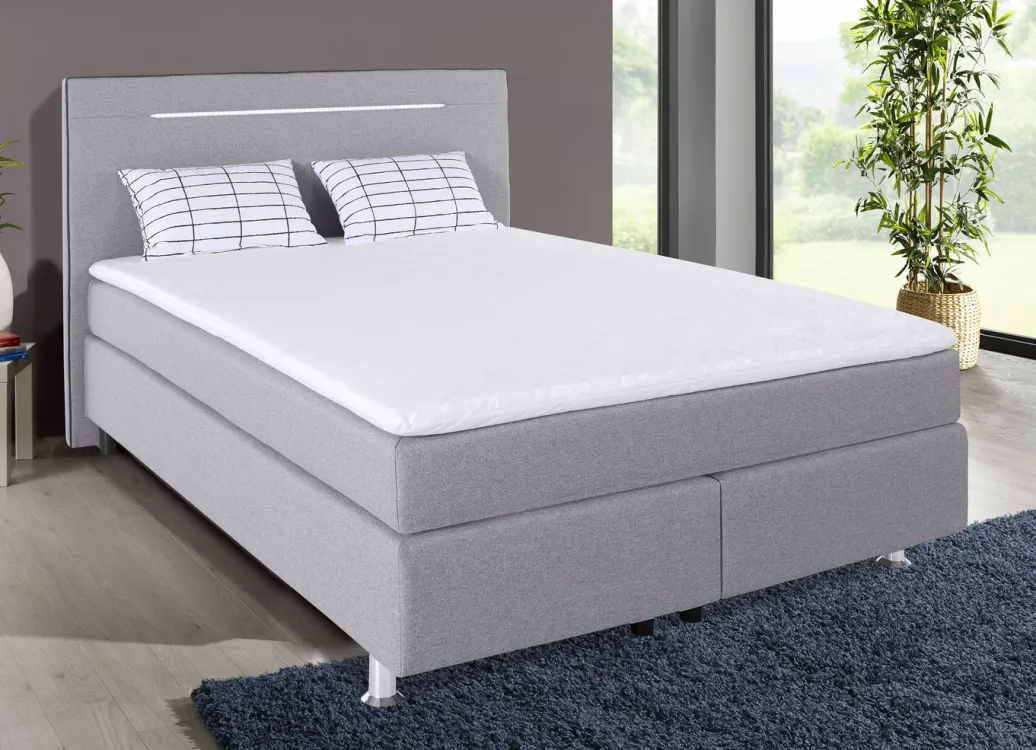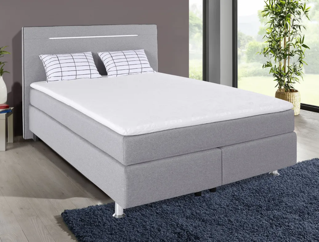 Ausgezeichnetes Boxspringbett auf stabilem Holzgrundgestell. Auf der Box liegt eine bequeme Bonnellfederkern-Matratze im Härtegrad 2 auf (Höhe 16 cm). Darauf liegt der 5 cm hohe PUR-Schaum-Topper auf und sorgt zusammen mit der Box und der Matratze für unvergleichlichen Schlafgenuss. Mit ansprechendem, strukturiertem Bezugsstoff (100% Polyester). Das Rückteil ist nicht mit Originalstoff bezogen. Auf chromfarbenen Kunststofffüßen (Höhe 11 cm).