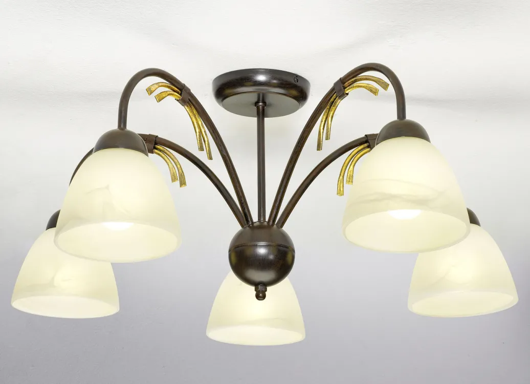 Deckenleuchte mit Gestell aus Eisen in der Ausführung 3-flammig und in Schwarz-Rost-Gold.
