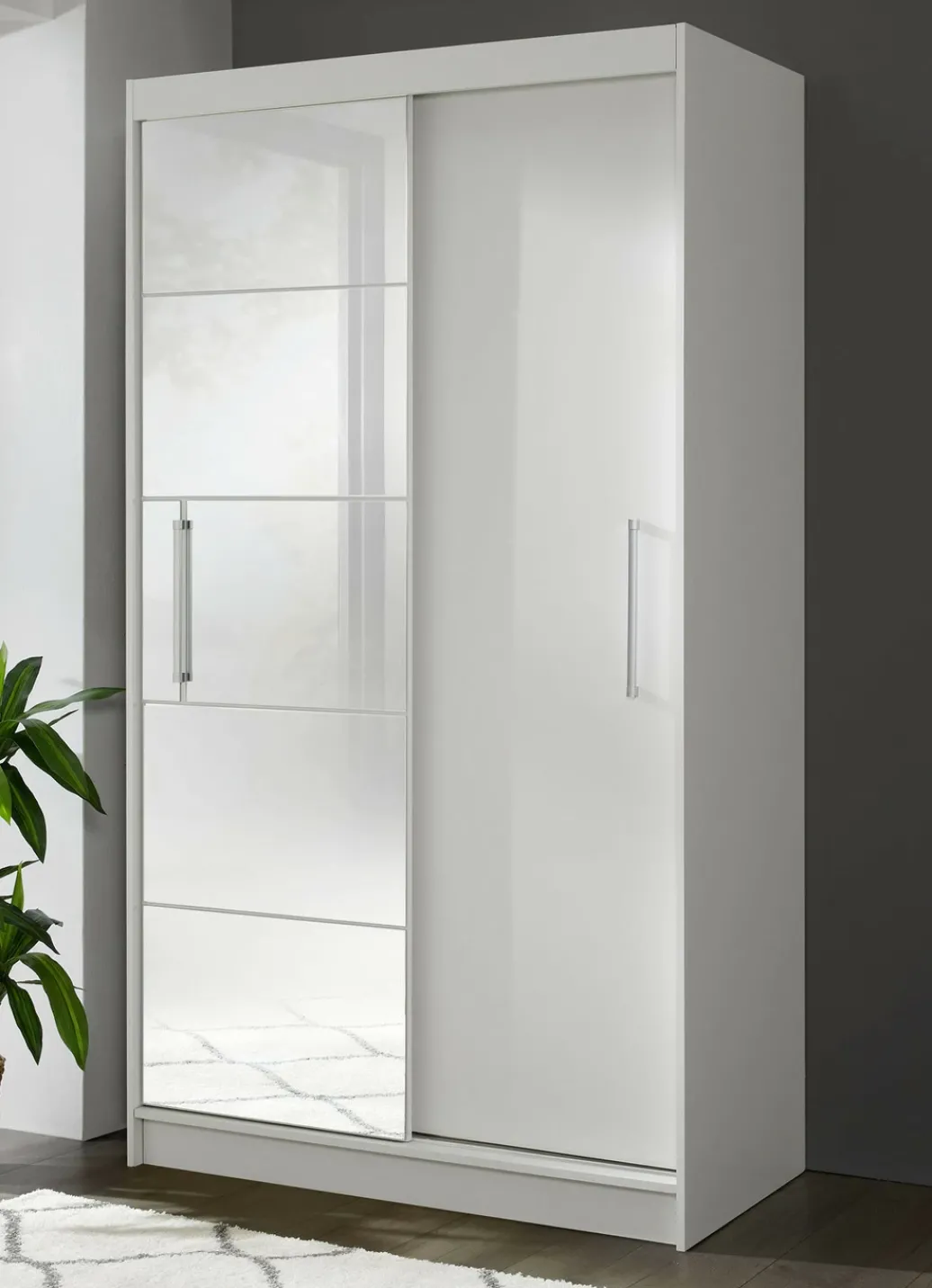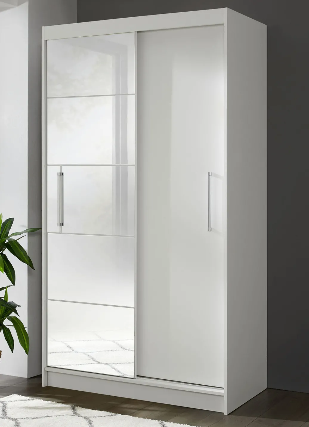 Durchdachter Schwebetürenschrank mit Spiegelfront in der Breite von 120 cm, ohne Aufbauservice sowie in Weiss.