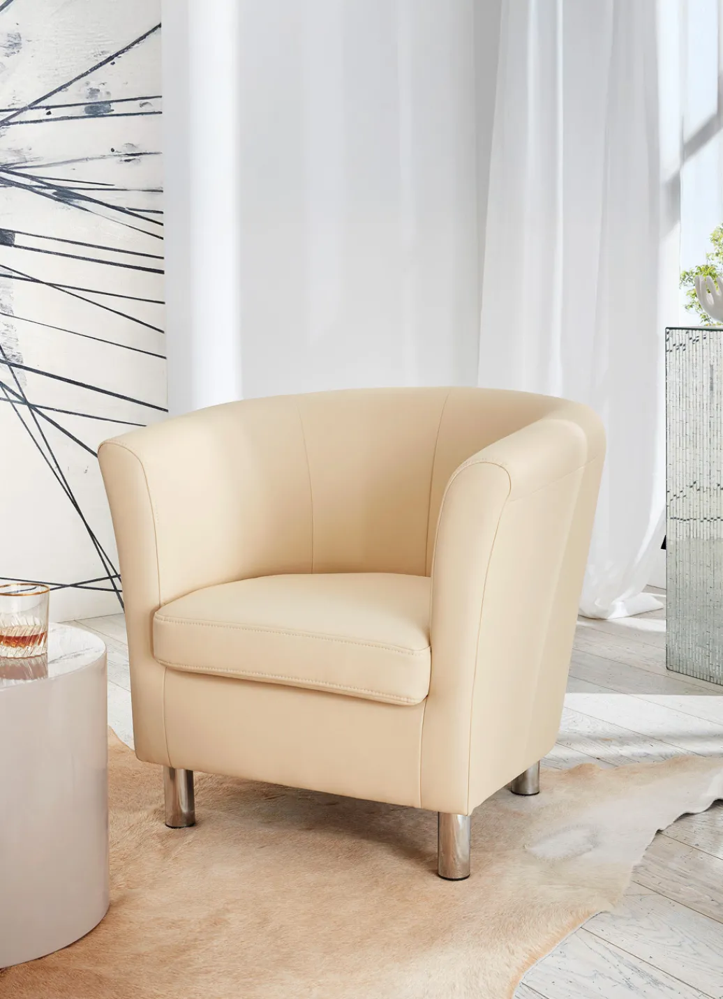 Edler Sessel auf stabilem Holzgrundgestell in Creme.
