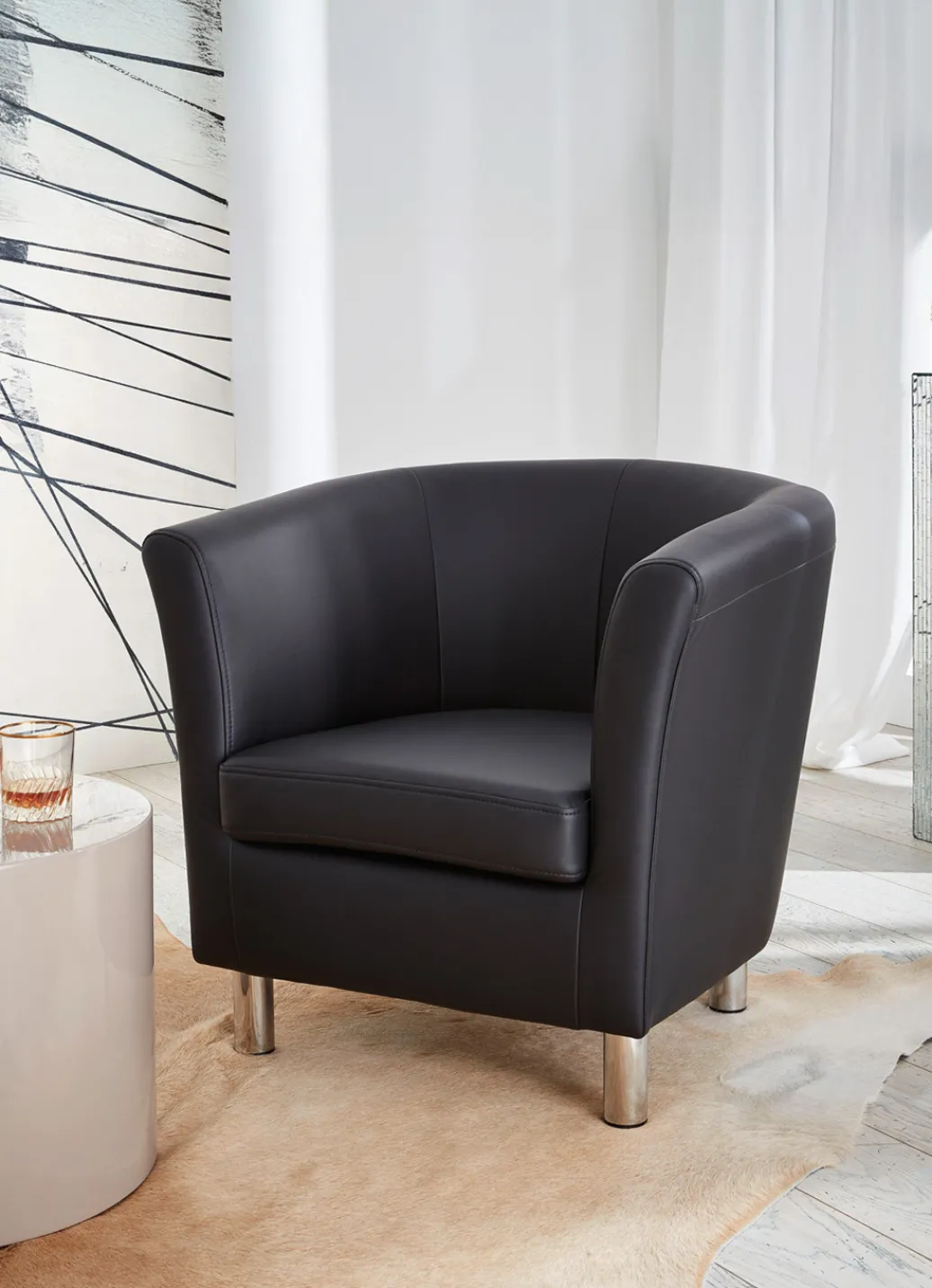 Auf stabilem Holzgrundgestell gefertigt, Sitzfläche und Rückteil mit Polyurethanschaum und Polstervlies ausgestattet. Kunstlederbezug aus 100% Polyurethan, Rückteil mit Originalstoff bezogen. Auf chromfarbenen Metallfüßen.