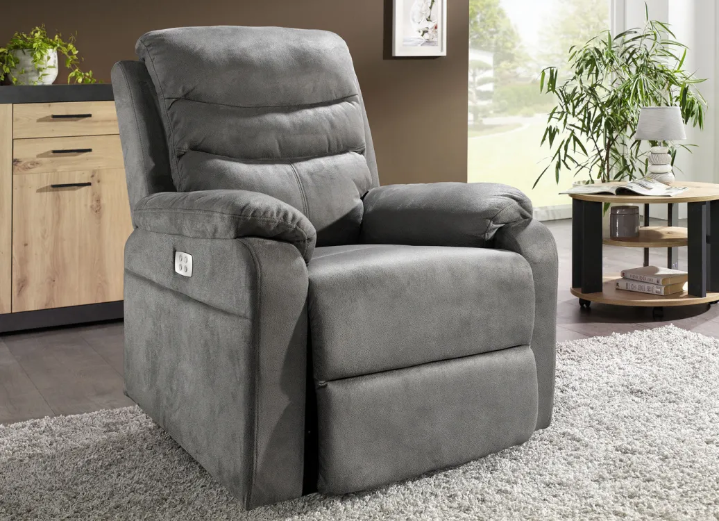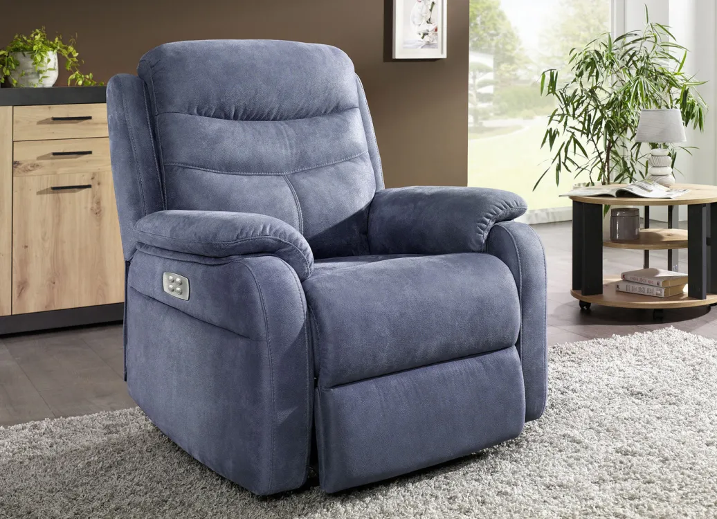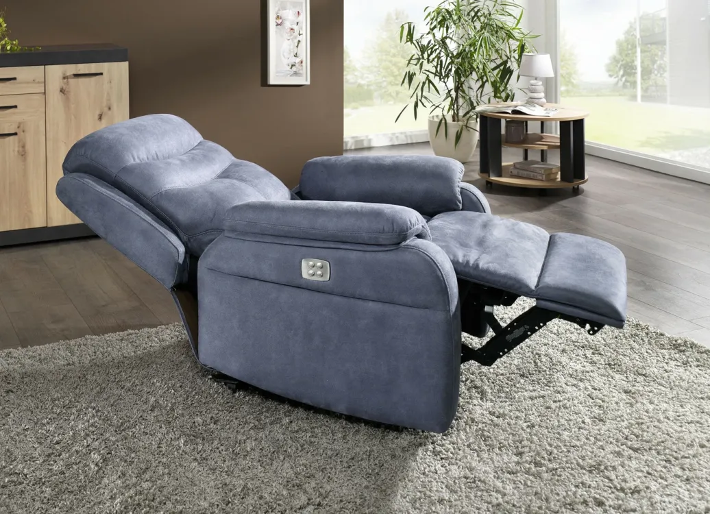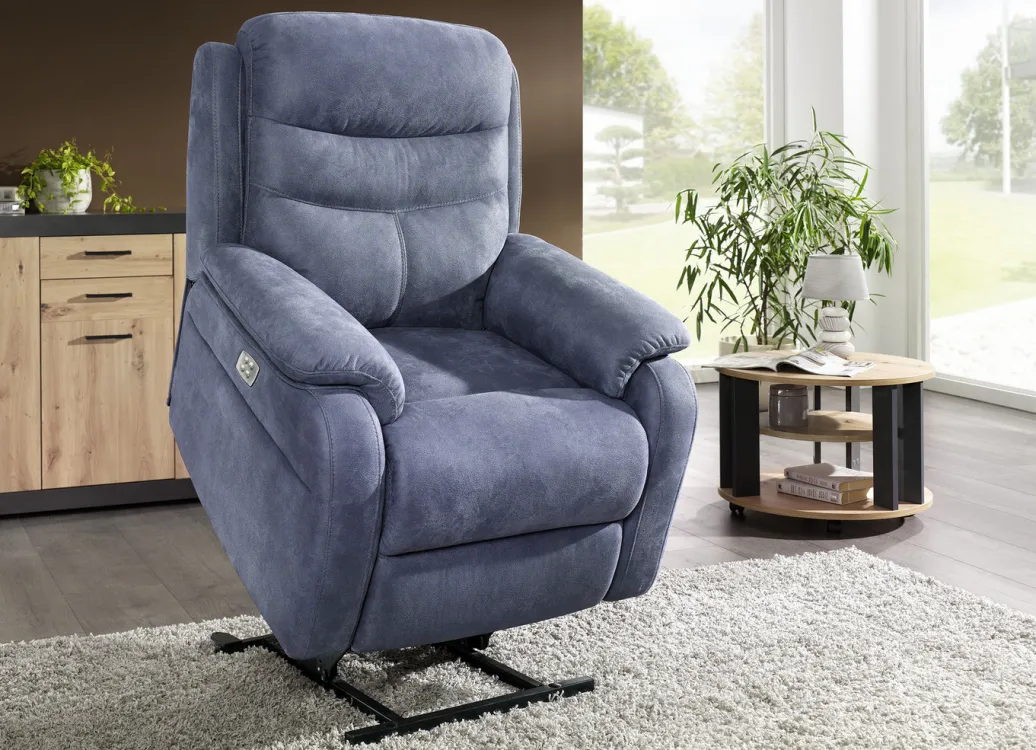 Elektrisch verstellbarer TV-Sessel mit Motor und Aufstehhilfe in Blau-Grau.