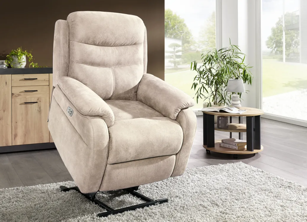 Die Schaumstoffpolsterung sorgt für komfortablen Sitzkomfort. Durch Bedientasten am Sessel sind Rücken- und Fußteilverstellung sowie Aufstehhilfe einstellbar, Stoppfunktion in jeder Position möglich. Maximale Belastbarkeit 180 kg.