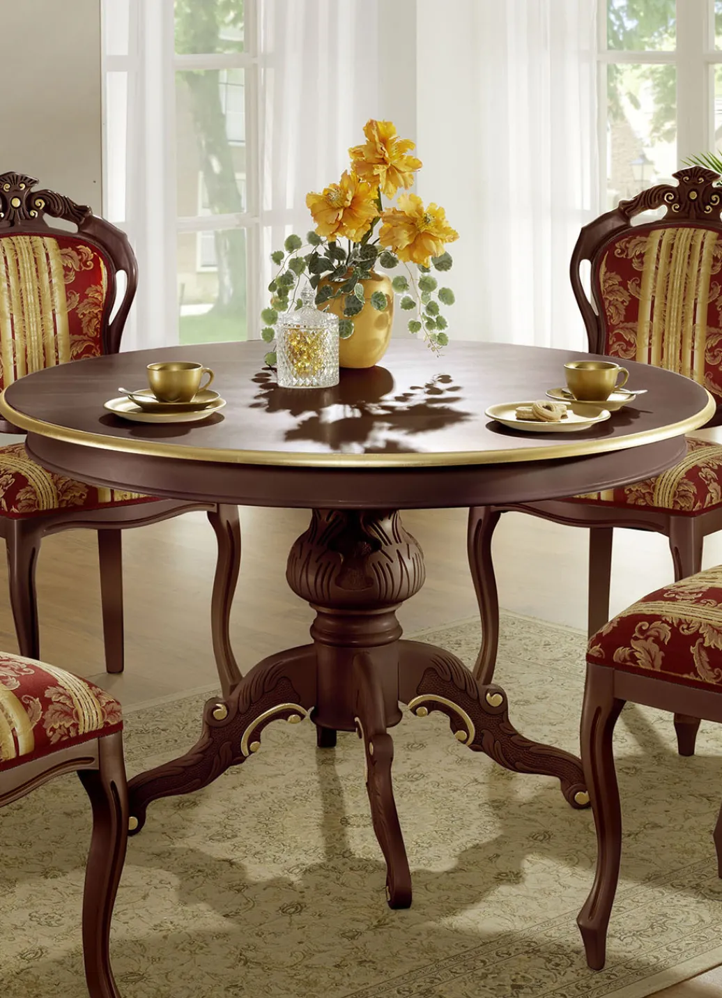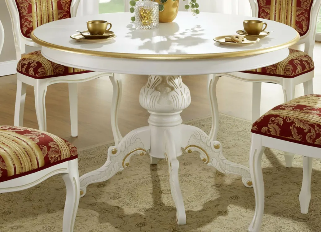 Fantastischer, runder Esstisch mit ganz besonderem Charme und zahlreichen Verzierungen! Mit edler, umlaufender Goldkante und 40 cm-Auszug. Die Füße des Tisches sind aus massivem Buchenholz. Maße: ø 120 cm, Höhe 78 cm. Die Lieferung erfolgt aufgebaut.