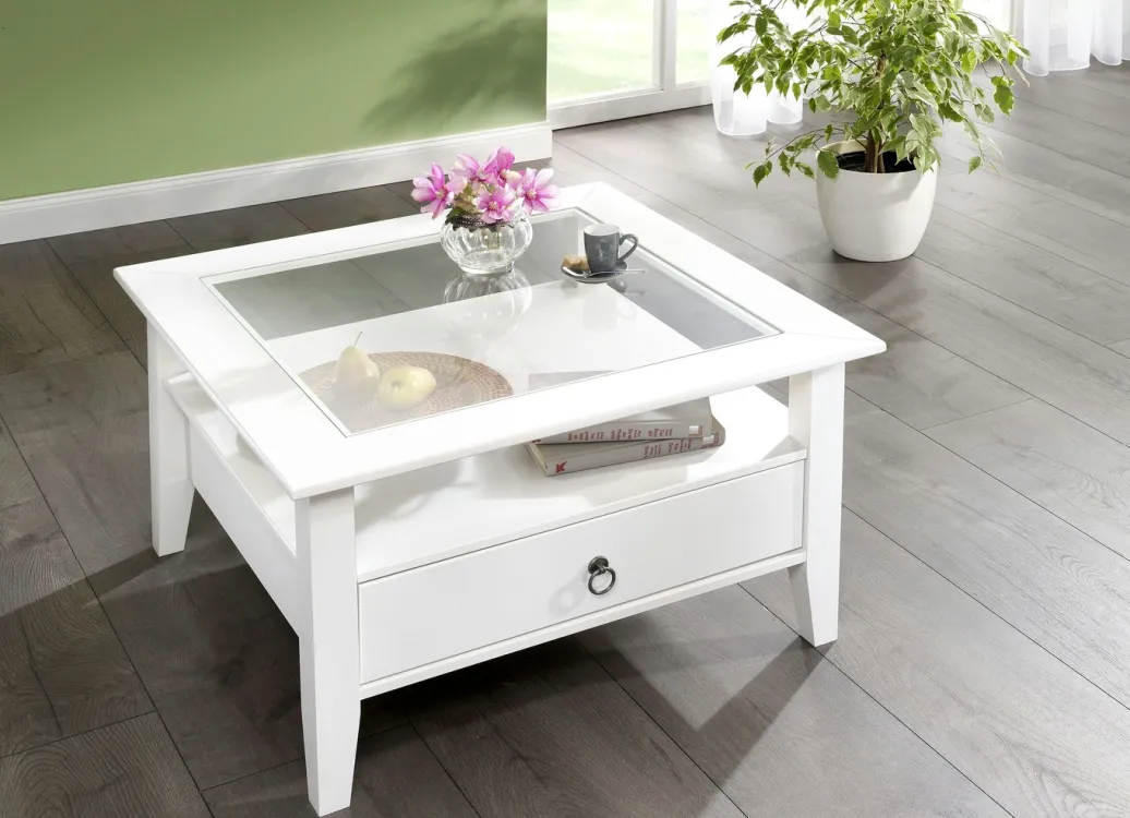 Moderner Couchtisch im aktuellen Landhaus-Stil. Aus massivem Kiefernholz gefertigt und weiß lackiert. Mit eingelassener Tischplatte aus klarem Sicherheitsglas.