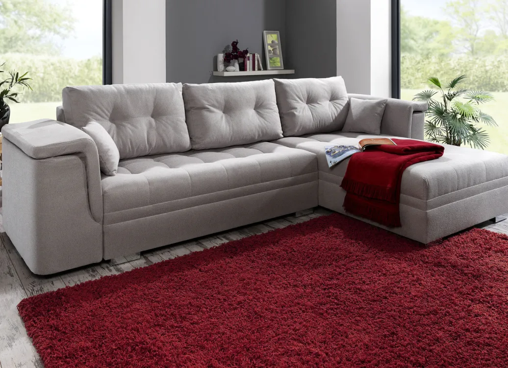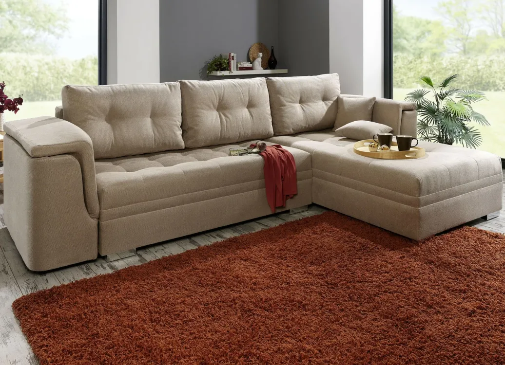 Moderne, ansprechende Polsterecke mit komfortabler Bettfunktion. Auf stabilem Holzgrundgestell mit Schaumstoff – Polsterung und Bonnell-Federkern-Unterfederung sowie Bettkasten ausgestattet. Attraktiver Stoffbezug (94% Polyester und 6% Nylon). Die Rückseiten sind mit Originalstoff bezogen, frei im Raum aufstellbar. Auf 6 Metallund 6 Kunststofffüßen.