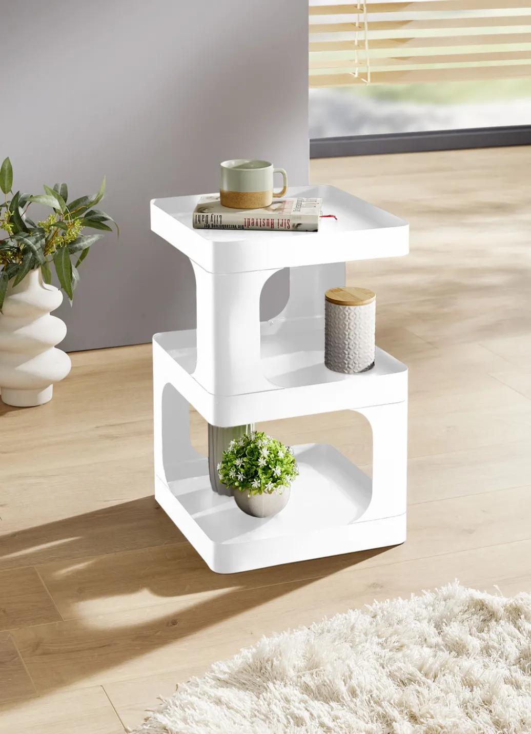 Modern und stilsicher zugleich zeigt sich dieser pfiffige Beistelltisch aus Metall. Mit 3 Ablagen, jeweils mit umlaufenden Rand gearbeitet. Maße: B35xH55xT35 cm. Die Lieferung erfolgt aufgebaut.