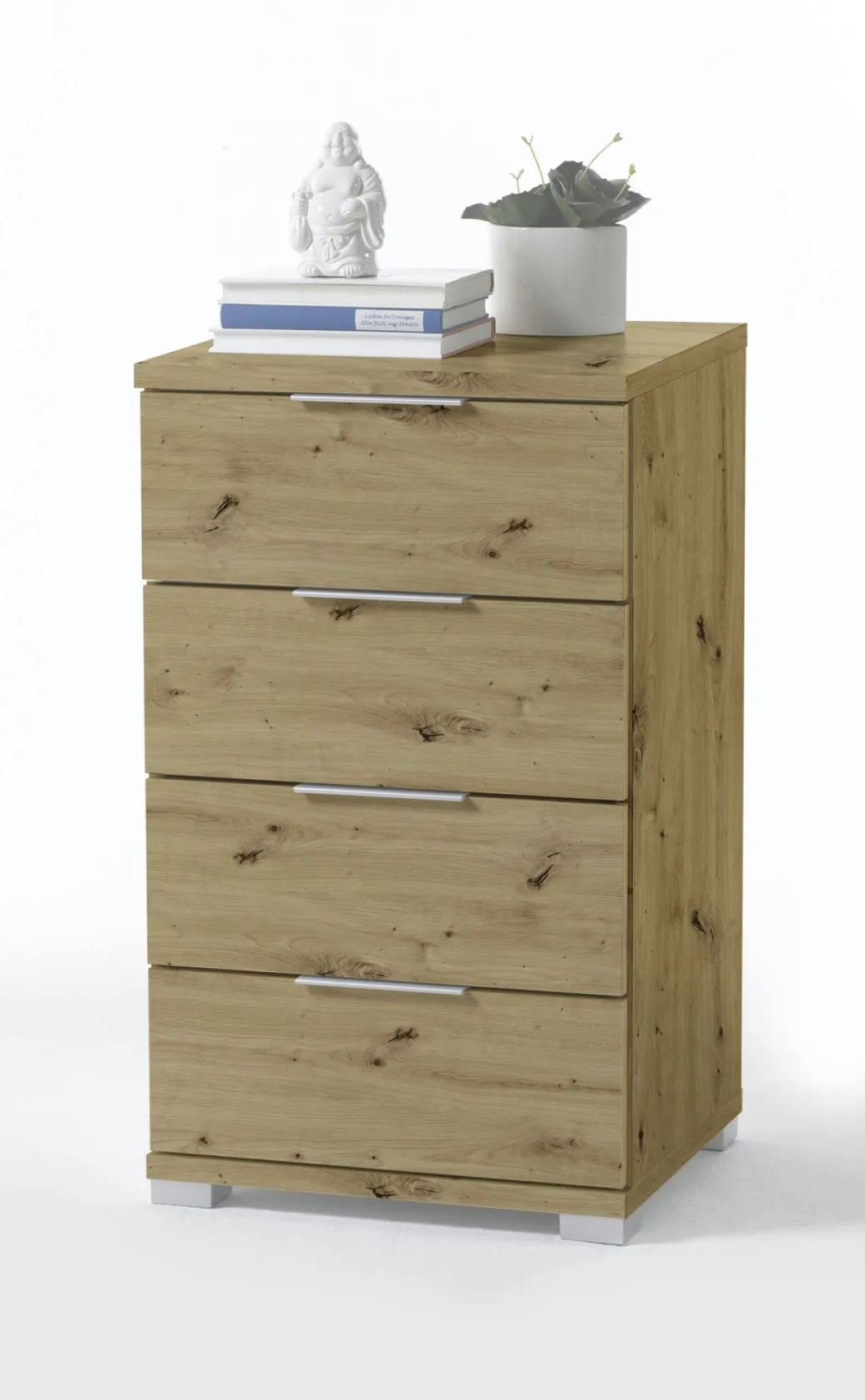 Nachttisch mit metallfarbenen Kunststoffgriffen in der Ausführung Nachttisch, 3 Schubladen und in Eiche.