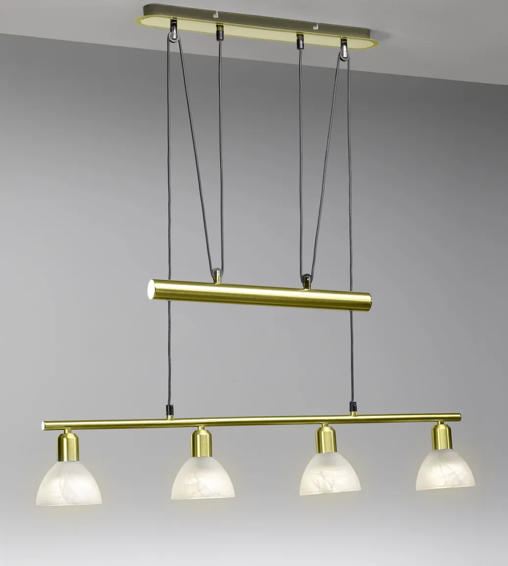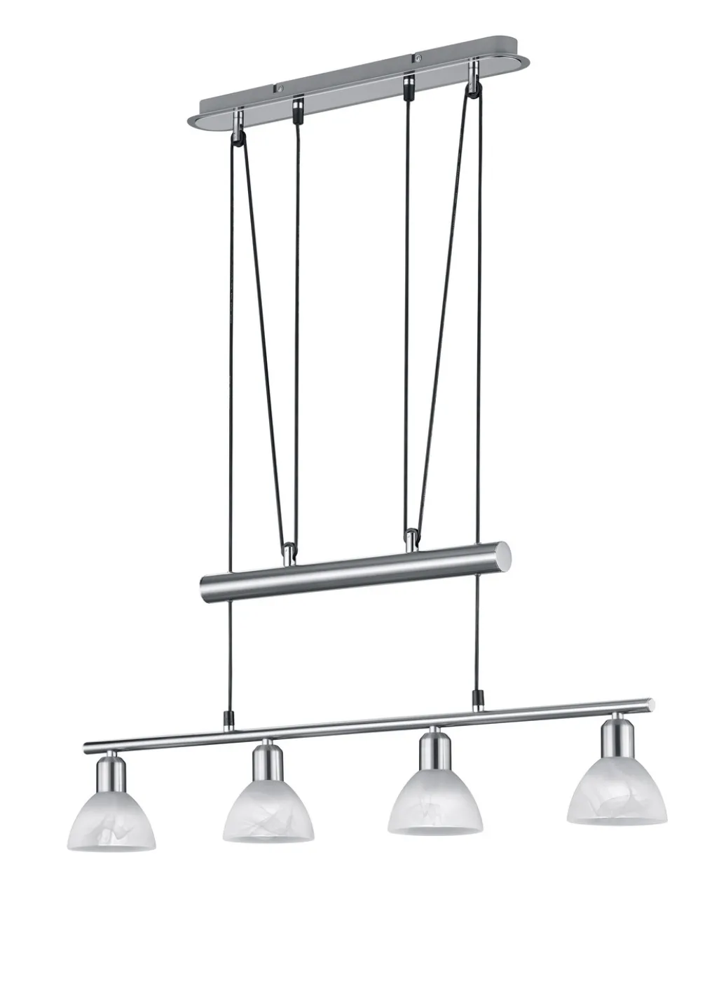 Schick und elegant zeigt sich diese ansprechende Pendelleuchte kombiniert aus mattem Metall und gläsernen Lampenschirmen.230 Volt. Lieferung erfolgt mit austauschbaren LED-Leuchtmitteln der Energieeffizienzklasse F (Skala A–G). LED, 4,9 Watt, 3000 Kelvin, 470 Lumen. Fassung 4x E14, je 4,9 Watt. Das Pendel ist in der Höhe zwischen 95 und 160 cm verstellbar.