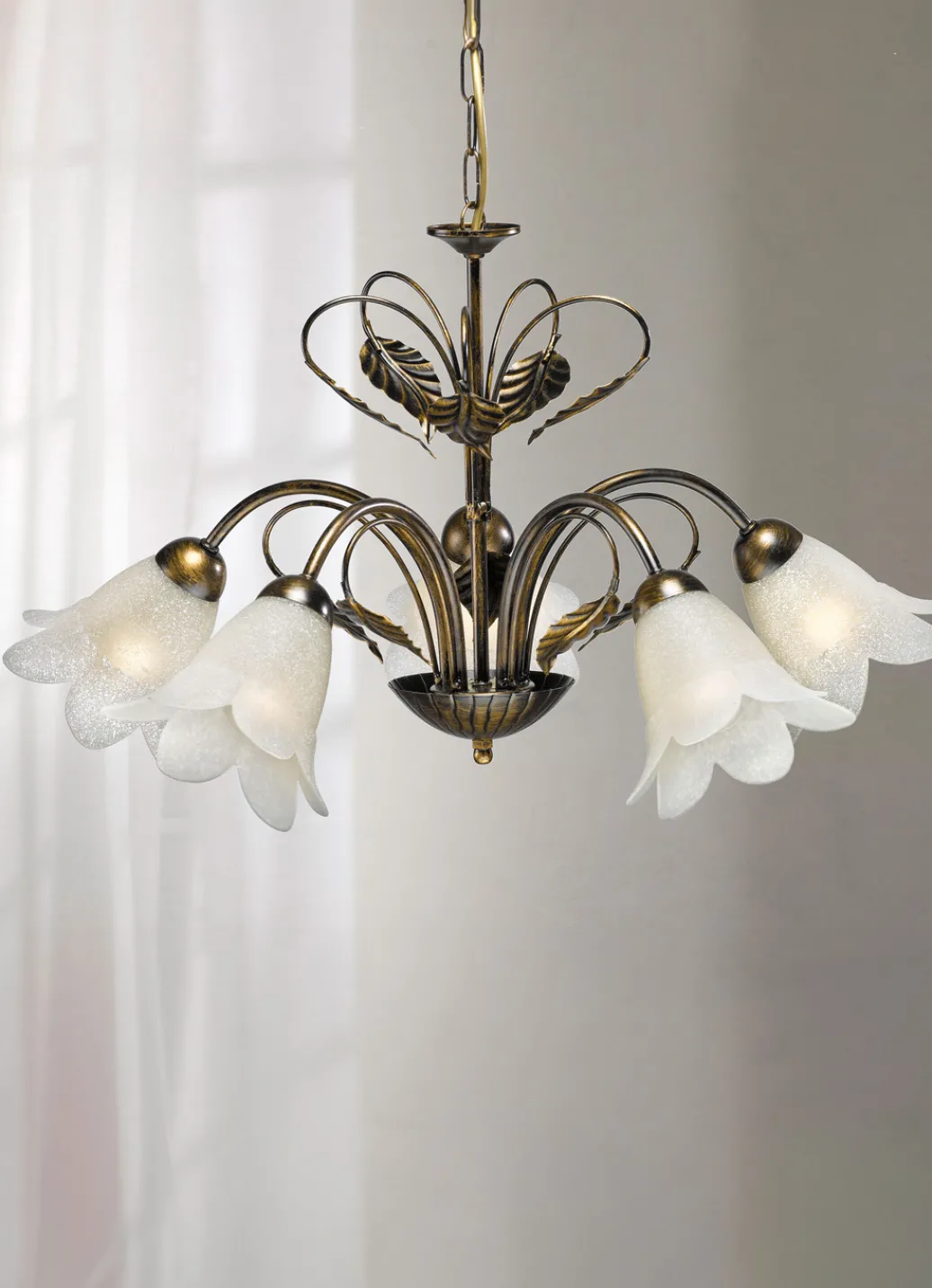 Klassisch schöne und detailverliebt verarbeitete Pendelleuchte aus braun-schwarz-goldfarbenem Metall mit dekorativem Blattwerk und satinierten blütenförmigen Glasschirmen gefertigt. Sie spenden stimmungsvolles Licht auch in den dunkelsten Räumen. 230 Volt. Die Lieferung erfolgt ohne Leuchtmittel. Mit Aufbau-Anleitung