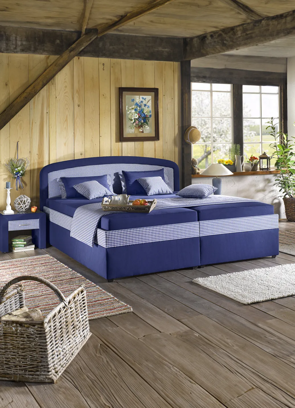 Polsterbett mit geräumigem Bettkasten mit einer Liegefläche von 80/200, in der Ausführung Federkern-Festposter, Liegehöhe 42 cm sowie in Blau.