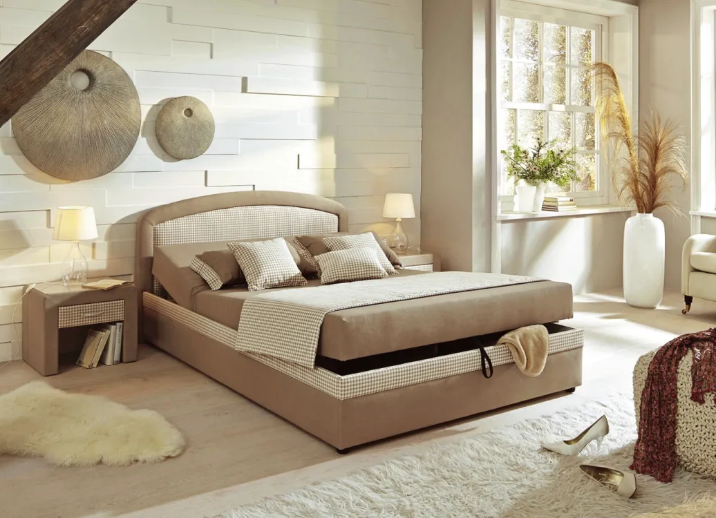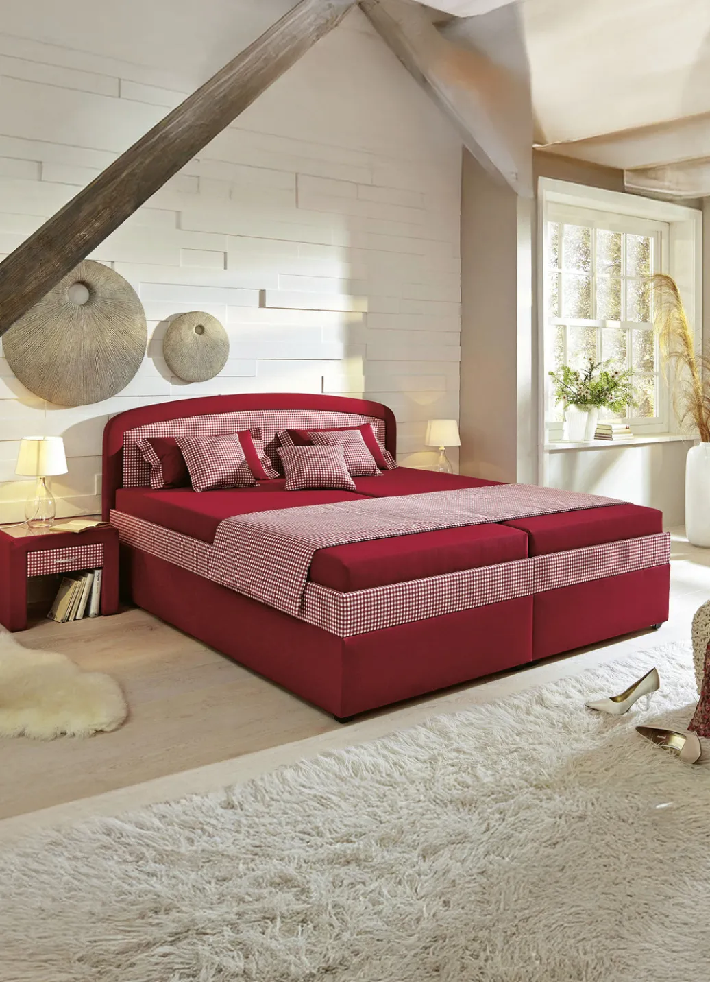 Dieses schicke Polsterbett erhalten Sie in 3 komfortablen Ausführungen. Liegefläche einfarbig glatt mit Druckstoff bezogen (75% Baumwolle und 25% Polyester). Geräumiger Bettkasten, innen weiß, vom Fußteil aus durch Spring-auf-Beschlag zu öffnen. Bettkasten und Kopfteil zweifarbig mit Druckstoff bezogen (75% Baumwolle und 25% Polyester). Auf Kunststoffgleitern.