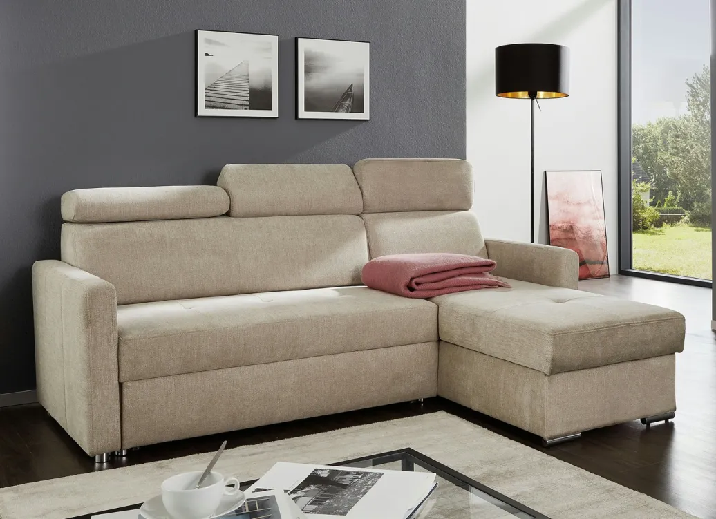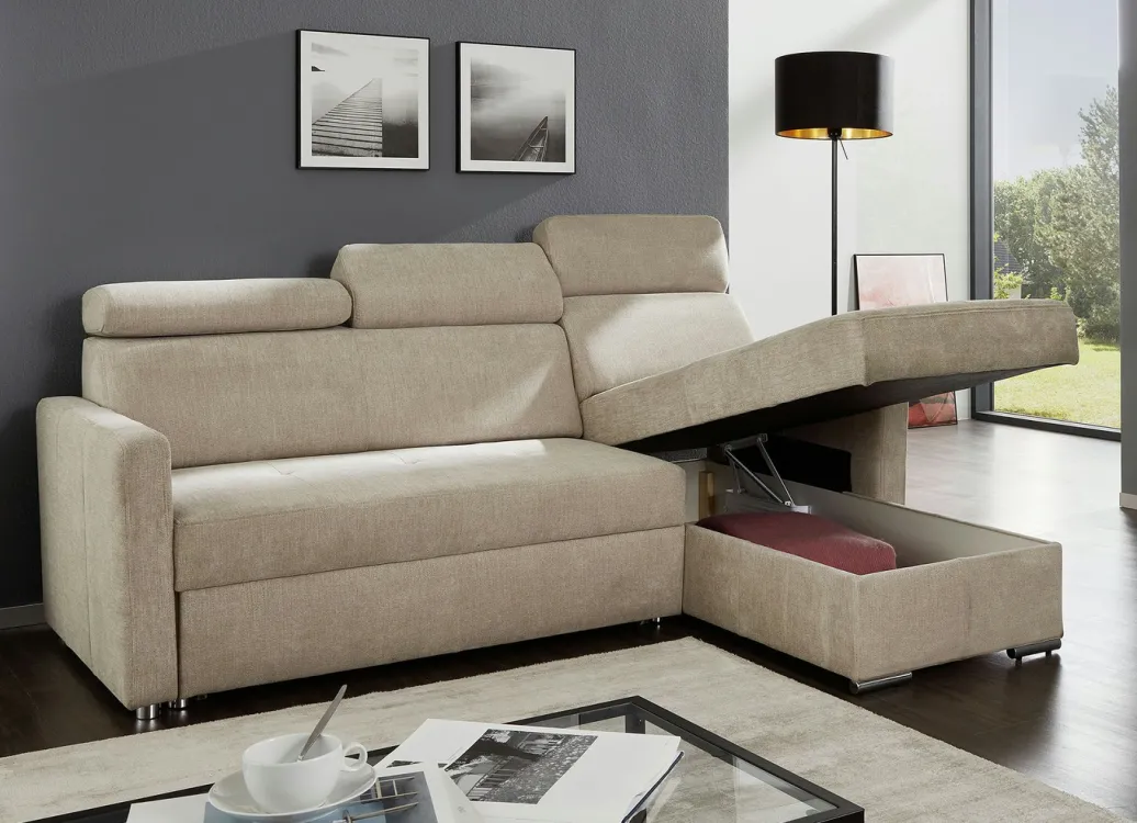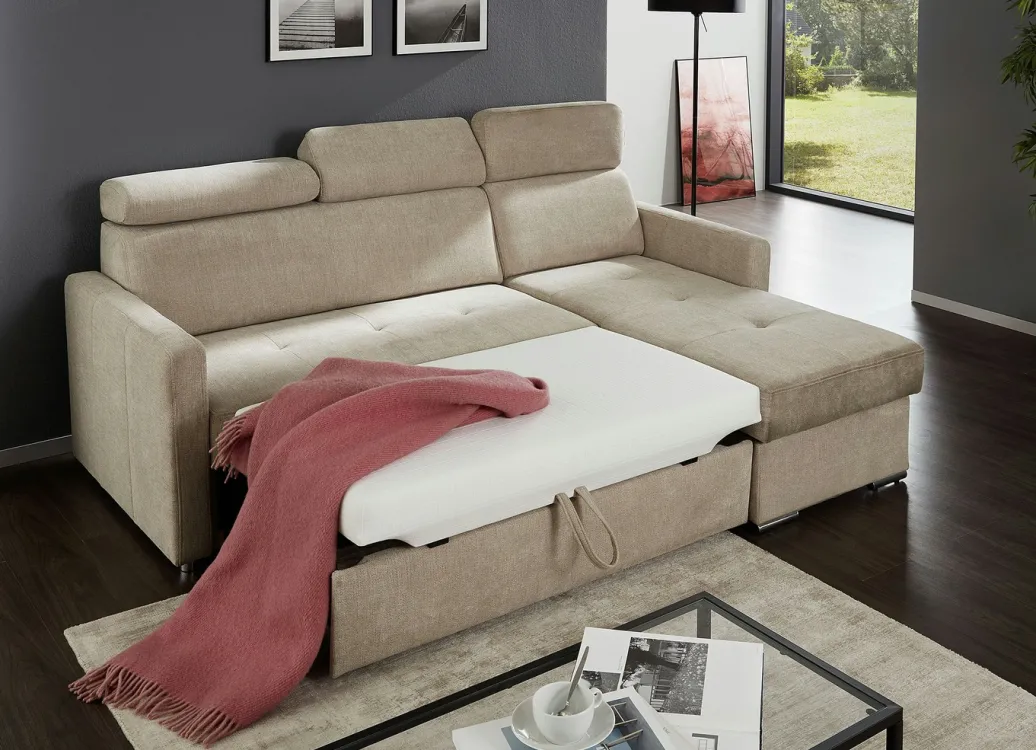 Polsterecke mit Schlaffunktion und Bettkasten in Beige.