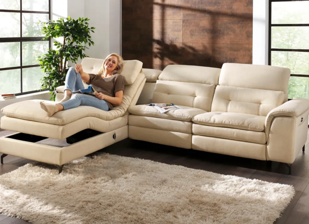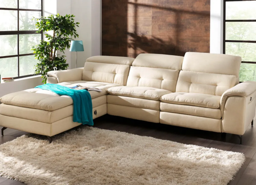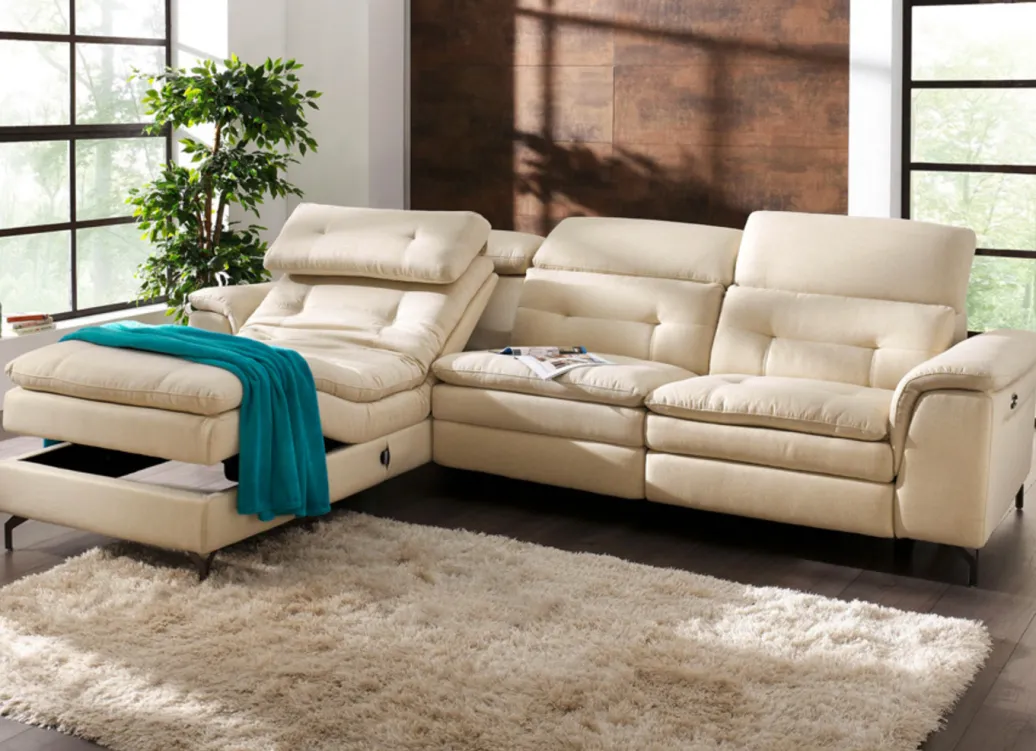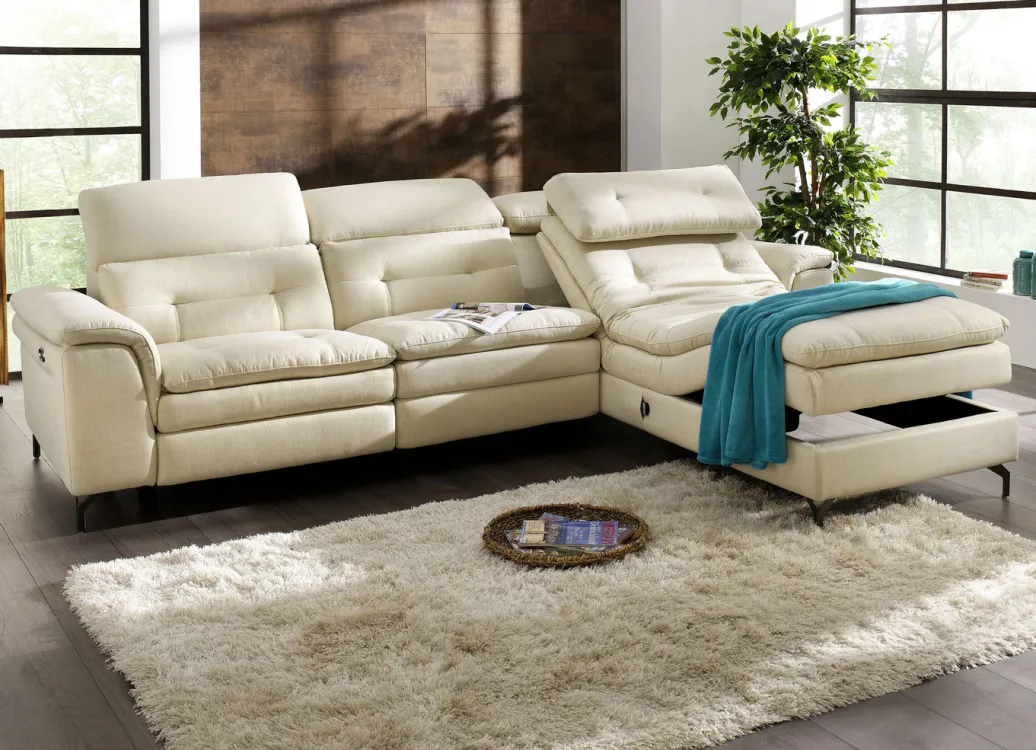 Polsterecke mit verstellbarer Kopfstütze und Ottomane in der Ausführung mit manuell verstellbarer Kopfstütze, in den Maßen 288×222 cm sowie in Beige.