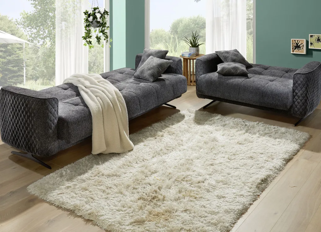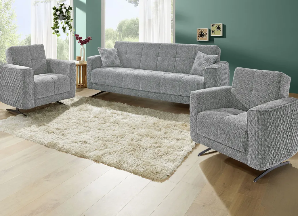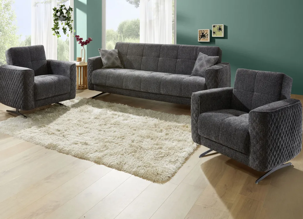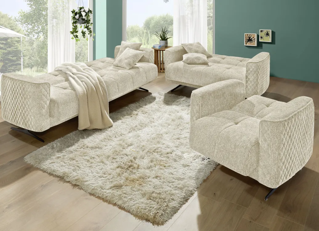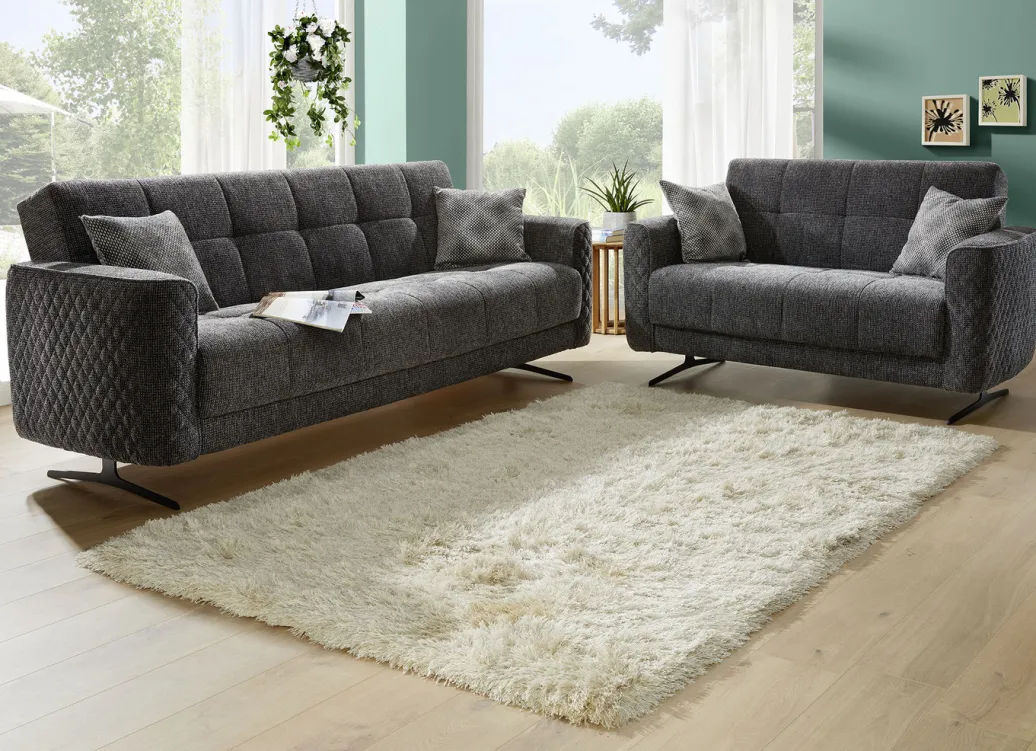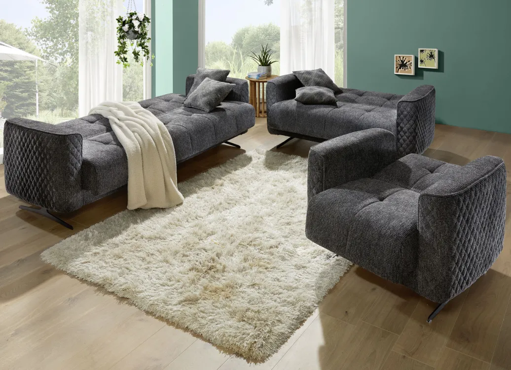 Besonders ansprechend und wunderbar gemütlich präsentieren sich diese Polstermöbel auf stabilem Holzgrundgestell. Mit Bonnellfederkern und Schaumstoffpolsterung sowie apartem, an den Außenseiten gestepptem Bezug (46% Polyester, 34% Baumwolle, 20% Polypropylen). Mit praktischem Stauraum unter den Sitzflächen der Drei- und Zweisitzer. Durch die clevere Kippfunktion sind der Drei- und der Zweisitzer im Nu in ein Gästebett verwandelt. Rückseiten mit Originalstoff bezogen, daher frei im Raum aufstellbar. Auf mattschwarzen Schwertkufenfüßen aus Metall.